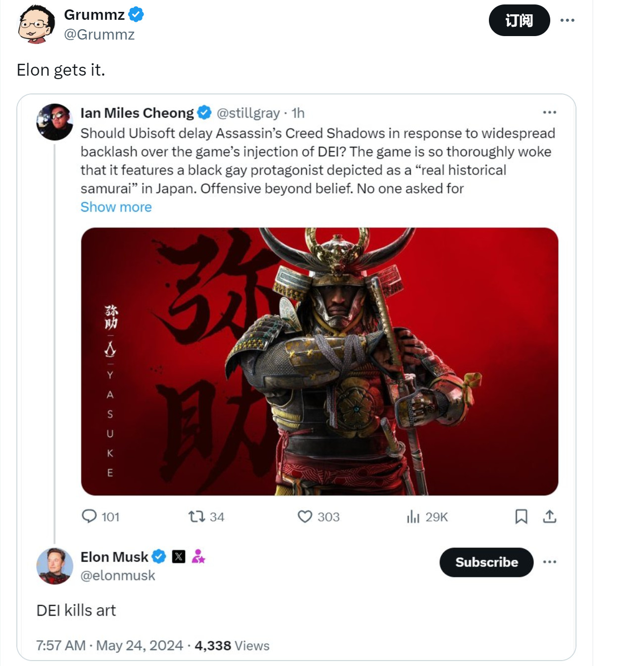 网友吐槽《刺客信条:影》 马斯克:多元化杀死了艺术