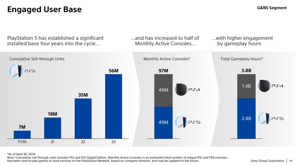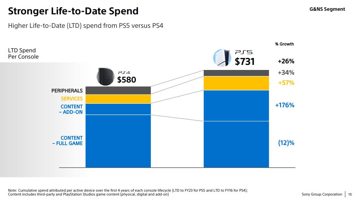 索尼推出第九世代主机PS5已经过去了快4年的时间,近日索尼在业务部门会议上,透露了PS5的销售额已经达到1060亿美元,即将赶超PS4创下的1070亿美元的总销售额,索尼也称PS5是“迄今为止最赚钱的一代主机”。 而值得注意的是,PS5目前的营收额已经突破100亿美元大关,已经超过PS4创下的90亿美元营收记录。 此外索尼还分享了一些来自用户群体的统计数据,截至4月30日,在PS5和PS4平台均有4900万用户,不过PS5方面的玩家参与度更高。在统计中的38亿小时游戏时间中,有24亿小时是来自PS5平台的。 而玩家消费方面,也是PS5平台遥遥领先。在PS5目前不到4年的周期里,与前代主机PS4同时期做对比,PS5用户在附加内容上的支出增加了176%,服务方面的支出增加了57%,外设上的支出也增加了34%,但在完整游戏内容上的花费减少了12%。 |