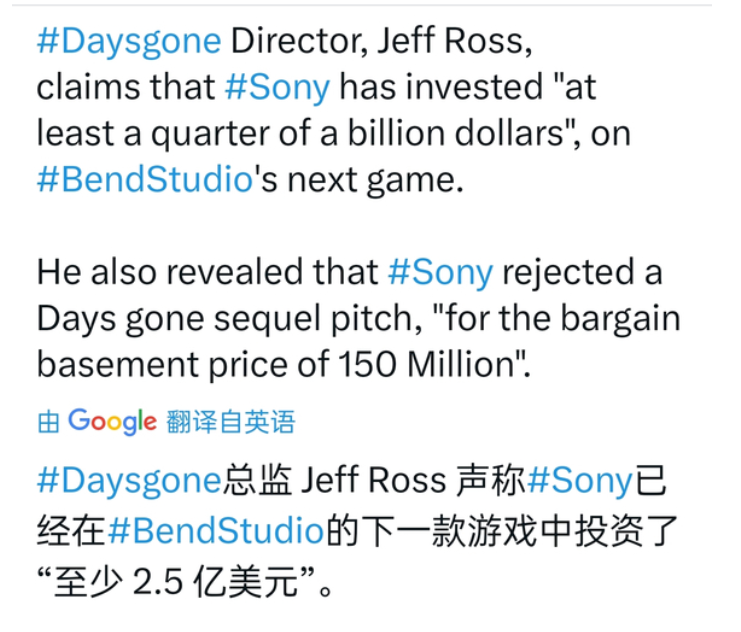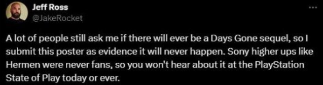索尼的第一方游戏从独占转为多平台发布,早已不是什么秘密了。最近《对马岛之魂》在登陆Steam平台后,就又掀起了一场游玩热潮。并且,同名真人剧集也在开发中,知名影星真田广之还将加盟。《对马岛之魂》这个IP的延续,基本上是板上钉钉的了。 然而并非所有销量表现不错,并登陆多平台的索尼游戏都能有下文。发布于2019年的开放世界动作游戏《往日不再》,近期正式确认不会有续作了。 游戏总监杰夫·罗斯在发布的动态中表示:“很多人仍然问我是否会有《往日不再》续集,所以我拿出这张海报来证明它永远不会发生。像赫尔曼这样的索尼高管从来都不是这款游戏的粉丝,所以你不会在今天的PlayStation State of Play或以后的任何时候听到这个消息。” 杰夫·罗斯所发布的图片,则是近期索尼发布的海报,里面涉及诸多索尼旗下的重要游戏IP。《最后生还者》、《血源诅咒》处于C位,最近表现突出《对马岛之魂》、《漫威蜘蛛侠》为“左右护法”。靠上一点的游戏是《神秘海域》和《地平线》,最醒目的是《战神》。 除此之外,海报还有很多其他的游戏IP,无论大小至少都说明了自己占据着一席之地,唯独《往日不再》缺席。可实际上,这款作品的市场表现和口碑都不算太差,放在市场上很像是育碧游戏的定位——开放世界罐头游戏、有特点、最初20小时体验不错,质量中规中矩。 在2023年的Steam平台索尼游戏的销量数据中,《往日不再》的170万销量高居第三位,仅次于《地平线:零之曙光》和《战神》。《漫威蜘蛛侠》以及《神秘海域盗贼合集》,都不如这款游戏卖得好。 非要给出一个不出续作的理由,可能就是《往日不再》的丧尸题材,跟索尼的亲儿子《最后生还者》撞了吧。而对于那些喜欢这款游戏的玩家来说,剧情结局中摘下面具露出感染者面貌的欧布莱恩,以及他所说的幕后组织,也将成为永远的遗憾了。 当前,《往日不再》的开发工作室Bend Studio,正在准备着新作的开发。据悉,这是款在线服务型游戏,预算高达2.5亿美元。但比较让人担心的是,Bend Studio以往并没有过开发这种类型游戏的经验。 对于这款新作,Bend Studio还未对外公布任何信息。考虑到以往他们所擅长的都是射击游戏,新作品很可能也属于这个方向。只是不知道最终的成果,能否达到当初《往日不再》的水准了。 那么大家对此又有什么想说的呢? |