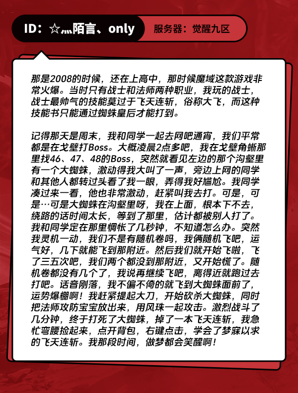 那熟悉的“唬~~~~,唰唰唰唰唰唰唰唰”音效再度响起,是否瞬间唤醒了无数魔域玩家的青春记忆?当年,飞天连斩凭借酷炫的技能效果加上打击感超强的音效,成为了大部分魔域玩家追逐的终极目标。每当这个声音在战场上响起,就意味着有一名勇士正以雷霆万钧之势,向敌人发起猛烈的攻击。而“打蜘蛛爆大飞”更是刻入每一位魔域玩家的DNA当中。如今,《魔域再起》的到来,就像一把钥匙,开启了无数《魔域》玩家心中尘封已久的记忆之门。 对于魔域玩家而言,飞天连斩不仅是一个技能,更是一段青春的记忆、一个时代的标志。它见证了无数魔友在虚拟世界中的成长与奋斗,记录了与兄弟并肩作战的默契与信任。每当这熟悉的音效响起,都仿佛在诉说着那些曾经的荣耀与梦想。 岁月流转,但魔域的热血永不止息。《魔域再起》将这一经典技能进行了完美的还原与优化,不仅保留了原有的酷炫特效和强大威力,还进行了更加精细的打磨和升级。无论是视觉效果还是打击感,都更加出色,更加震撼人心。 无论你是为了找回那份遗失的激情,还是为了追忆那段美好的青春,都不妨踏入《魔域再起》的世界一探究竟! 想了解更多关于《魔域再起》的最新信息吗?请立即通过微博、微信、抖音、快手等社交媒体平台搜索“魔域再起”官方账号,最新游戏资讯、预约活动详情等,等你来探索! |
