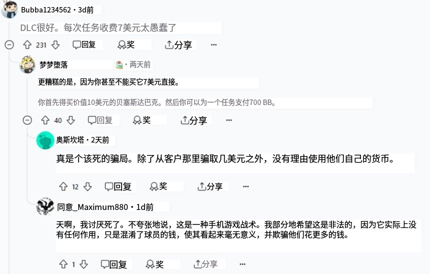 2023年的TGA年度最佳游戏由《博德之门3》摘得,玩家和业内媒体普遍都认为它的获奖实至名归。然而如果把时间拨回到年初,B社打磨多年的开放世界游戏《星空》,才是更受期待的作品。 只是《星空》上线后并没有表现出应有的水准,在优化问题、内容体量等方面,都存在很大的提升空间。虽然最终的销量不至于亏本,但也没有给玩家带来什么期待,Steam口碑始终维持在“褒贬不一”的区间。 而在距离首发9个月后,近期《星空》还遭遇了玩家们的差评轰炸。 事件始于上周XBOX官方的展示会,B社公开了《星空》的首个DLC“破碎维度”,并于本周二进行了大规模更新。其中包括官方编辑器Creation Kit、全新的追踪者联盟任务等。 原本游戏的内容扩充对玩家们来说是件好事,可新发布的任务却需要大家通过700积分来解锁。(积分获取需要最低选项为10美元1000积分) 这种逼氪行为,招致了老玩家们的不满。毕竟如果一开始将其当成DLC的费用,玩家们还能自由选择。如今大伙都玩上了DLC的内容,却需要为某个任务付费,这样的模式令人无法接受。谁也不知道,以后这样的内容更新模式会不会成为常态。 近三十天内,《星空》的好评率已经从60%掉到了40%。倘若B社不调整现有的策略,或许口碑数据还会继续下跌。作为一款单机游戏,《星空》发售9个月后还遭此一劫,恐怕连陶德也想不到这一幕会发生吧。 曾几何时,B社游戏是精品游戏的代名词,《上古卷轴》系列和《辐射》系列经久不衰。不久前凭借《辐射》真人剧的成功,《辐射》IP还迎来了翻红。可对于B社这样的大厂来说,他们仍需推出一款新的作品来证明自己。 对于新游戏IP的打造,老玩家们很难再抱有太高的信心了。关于《上古卷轴6》、《辐射5》的开发进度爆料,或许才是更受关注的选项。那么大家对现在的B社游戏,又有什么想说的呢? |