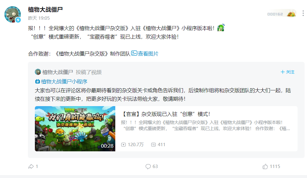 休闲游戏作为最具适普性的游戏类型,主打一个不挑玩家。无关性别、年龄段,玩家都能加入进来,寻得一种放松的感觉。而《植物大战僵尸》又是休闲游戏中的佼佼者,整个智能机时代都存在它的身影。 时至今日,《植物大战僵尸》IP已经走过了十五年,可因为在玩法内容方面的创新性不足,它也渐渐远离了大伙的视野。但在近期,游戏官方所带来的一则重磅消息,却引发了玩家们的关注——《植物大战僵尸》杂交版现已入驻创意模式! 《植物大战僵尸》杂交版,是由玩家“潜艇伟伟迷”开发的同人作品。从2017年首次尝试开发制作,这些年来他通过不断更新与完善,最终才呈现出当前这个极具可玩性的版本,并得到了广大网友们的一致好评。 《植物大战僵尸》杂交版本质上是基于原本的植物、僵尸素材,进行融合、二创后推出的版本。因为不同角色间的混搭,游戏的娱乐性和可玩性得到了大幅提升。而作者“潜艇伟伟迷”本人,也因此被戏称为“电竞孟德尔”。 《植物大战僵尸》杂交版这款同人作品的爆火,为“潜艇伟伟迷”带来了很高的关注。月初他在B站发布的致谢视频,播放量甚至达到了1600万次。当时就有消息称,《植物大战僵尸》有意与他合作,只是大家都没想到杂交版能这么快就进入到正式游戏中。 而不仅如此,《植物大战僵尸》杂交版登陆的是《植物大战僵尸》小程序版,这意味着大家无需借助电脑设备,就能够随时随地体验到这款游戏。这种合理利用碎片时间,做出轻量化减负调整的运作模式,当然也是大家想要看到的。 同人作品被加入到正式版游戏中,这无疑是对作者的一种认可。毕竟同人作品的作者,很多都是原版游戏的爱好者,因为自身兴趣才进行创作的,这个过程往往需要“用爱发电”。如今能够跟官方合作进行游戏开发,也是种双赢。 如今《植物大战僵尸》官方承诺,后续会跟杂交版的团队合作,来带更多新的玩法模式。而未来也希望《植物大战僵尸》这个有着十五年历史的优秀休闲游戏IP,可以为玩家们带来新的惊喜吧。 那么大家对此又有什么想说的呢? |