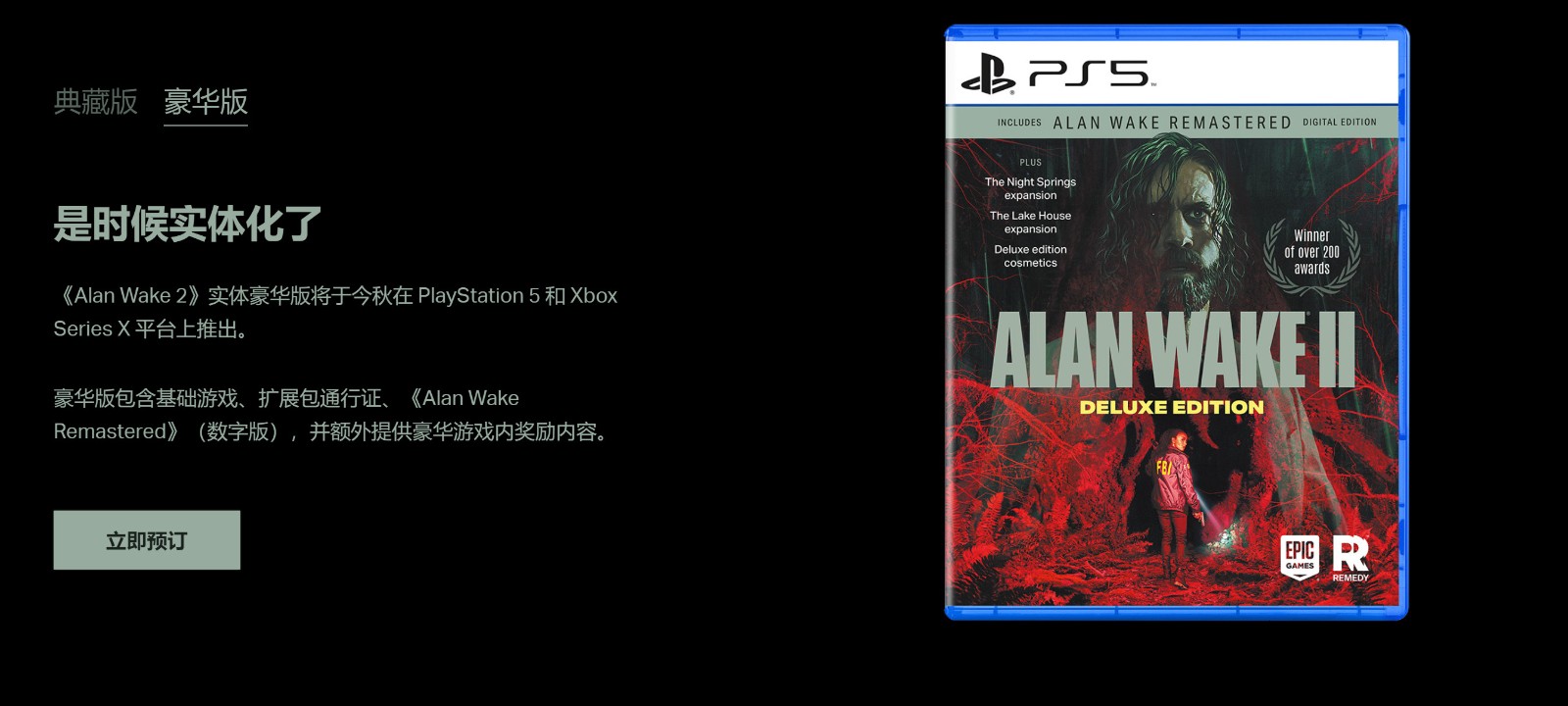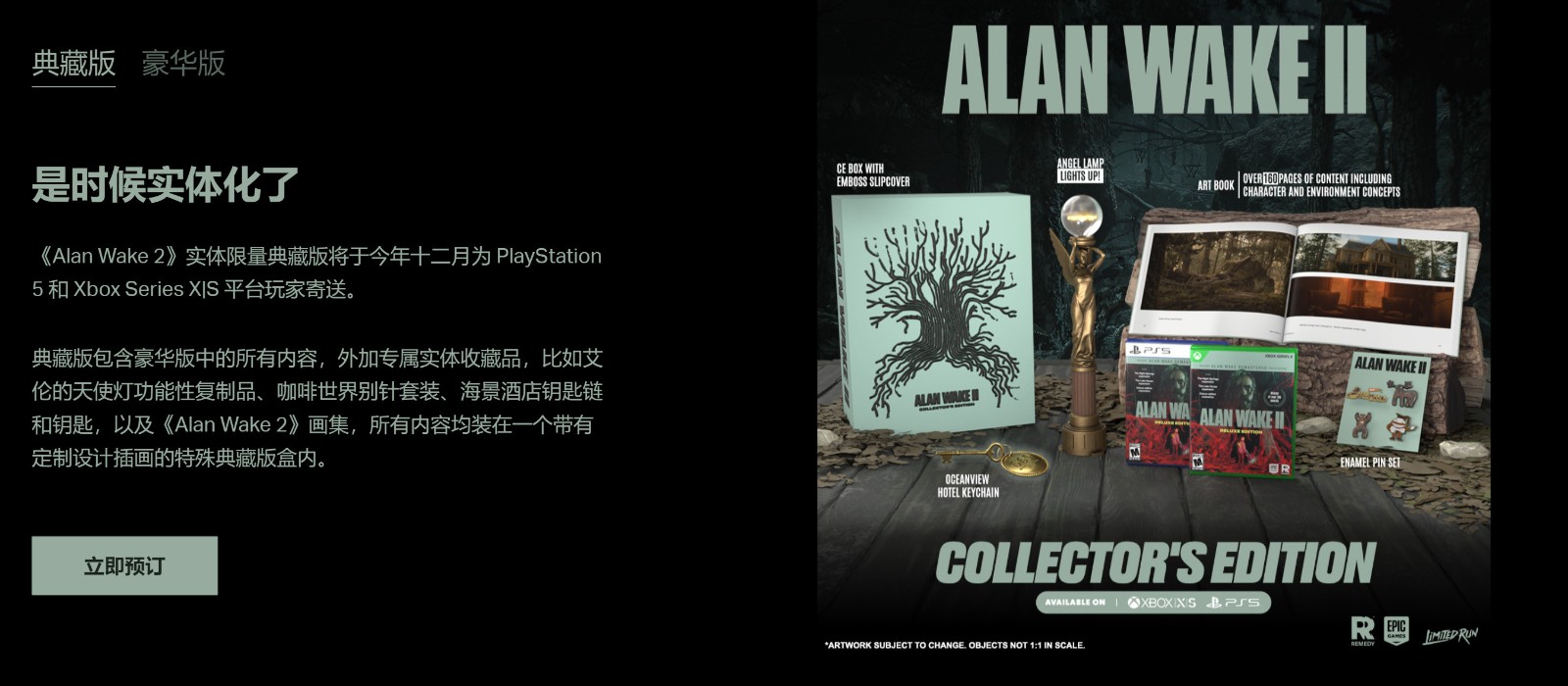 在公布《心灵杀手2》实体豪华版发售日的同时,开发商Remedy还公布了《心灵杀手2》第二个DLC“湖边小屋(The Lake House)”的上线时间:今年10月。 “湖边小屋”DLC官方介绍: “湖边小屋是由某个独立政府组织建立的一座神秘设施,坐落在巨釜湖边。该设施一直用于进行秘密研究……直到麻烦不期而至。 探索湖边小屋,开启一段冒险,因为太平洋西北部与黑暗之地即将再次发生碰撞。” 《心灵杀手2》首个DLC“夜春镇”已于6月8日上线。 实体版消息——仅限Xbox Series X和PS5 实体豪华版10月22日推出 实体限量典藏版12月推出 关于“夜春镇”DLC: 现实世界在艾伦·韦克那难以自抑的想象力影响之下发生着巨大的弯曲扭转。当韦克为电视剧《夜春镇》撰写剧本时,他寄希望于这项任务能助他找出一条逃生之路,不料无意之中却令现实发生了进一步的扭曲。此扩展包通过三段风格化的剧集娓娓展开,将熟悉的角色和场景变成出乎意料的全新事物。 进入黑暗之地 《夜春镇》将引领玩家踏上一段穿越神秘黑暗之地的旅程,在这个领域之中,现实世界在艾伦·韦克那难以自抑的想象力影响之下发生着巨大的弯曲扭转。当韦克为电视剧《夜春镇》撰写剧本时,他寄希望于这项任务能助他找出一条逃生之路,不料无意之中却令现实发生了进一步的扭曲。此扩展包通过三段风格化的剧集娓娓展开,将熟悉的角色和场景变成出乎意料的全新事物。 每个剧集都能带来十分独特的体验,突出玩法和叙述等不同的方面,确保每个故事都让人耳目一新,但同时又与不断扩展的《Alan Wake》宇宙融为一体。 在《时空破坏者》中,你将化身为长相与辉落镇警长蒂姆·布瑞克酷似的演员,而后者便是那位全力追捕凶残的多重世界之主的多元宇宙英雄。 在《北极星》中,跟随兄弟姐妹踏上旅程,这个女人与联邦控制局局长杰西·法登惊人地相似。在她的任务中,玩家要一边探索一个怪异的变版咖啡世界,一边尝试找到她失踪的兄弟。 《头号粉丝》讲述的是服务员的故事,她长得几乎跟老鹿餐厅的罗丝·玛丽戈尔德一模一样,她决心要在一个文学批评演变成文字战争的世界里拯救她的偶像——作家。 当玩家深入探究这些熟悉角色的变版时,欢迎他们对于哪些是真实的,哪些是艾伦·韦克痛苦的想象力所虚构出来的内容做出质疑。 《夜春镇》三个剧集当中,每一集都会带来四个新的奖杯或成就,为奖杯猎人和完美主义者增加了共计12个全新挑战。 实体版 PlayStation 5 和 Xbox Series X 实体版现已开放预订。 《Alan Wake 2》提供哪些不同的版本? 实体豪华版,推出日期:2024 年 10 月 22 日: 基础游戏 数字豪华版项目: 萨贾的北欧霰弹枪皮肤 艾伦的国会大厦霰弹枪皮肤 萨贾的深红色风衣 艾伦的名人西装 萨贾的提灯护身符 扩展包通行证(包括夜春镇和湖边小屋) 印有专属插图的双面封面套 《Alan Wake Remastered》数字版(在盒内以代码形式提供) 建议零售价:$79.99 / |