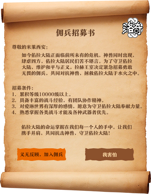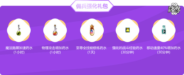 在佑拉大陆各地,同时出现了神兽。佑拉大陆再次陷入危机之中...艾泰恩和爱蕾雯达成了秘密协议,正在招募能够为艾莱克王国和雷米拉斯教团,解决前线危机的雇佣兵。 【佣兵招募】 招募时间:6/26 12:00~7/10 23:59 加入佣兵后即可领取一份G26更新纪念箱子,在7/10 维护后才能开启。 G26更新纪念箱子 我要涂色羊召唤口哨 彩色闪光2次头衔兑换券 彩虹油刷 红色油漆桶(最大伤害高级图腾) 蓝色油漆桶(魔法攻击力高级图腾) 黄色油漆桶(移动速度高级图腾) 绿色油漆桶(额外伤害高级图腾) 限期增加银行最大额度使用券(10亿)(30天) 浪漫农场钻石种子(不可交易) 战斗支援礼包 DIY染色模板选择箱 年龄身高药水选择箱 强化的战斗经验值药水(30分钟)(4倍) 转生秘药 美容点10点 【佣兵训练任务】 训练时间:7/3 12:00~7/10 23:59 完成训练任务,达到10点训练值,即可领取佣兵强化礼包。 佣兵强化礼包 为了能让米莱西安更好的迎接即将到来的危机,我们准备佣兵奖励和训练任务,现在就加入佣兵一起为了守护佑拉大陆成长吧! |