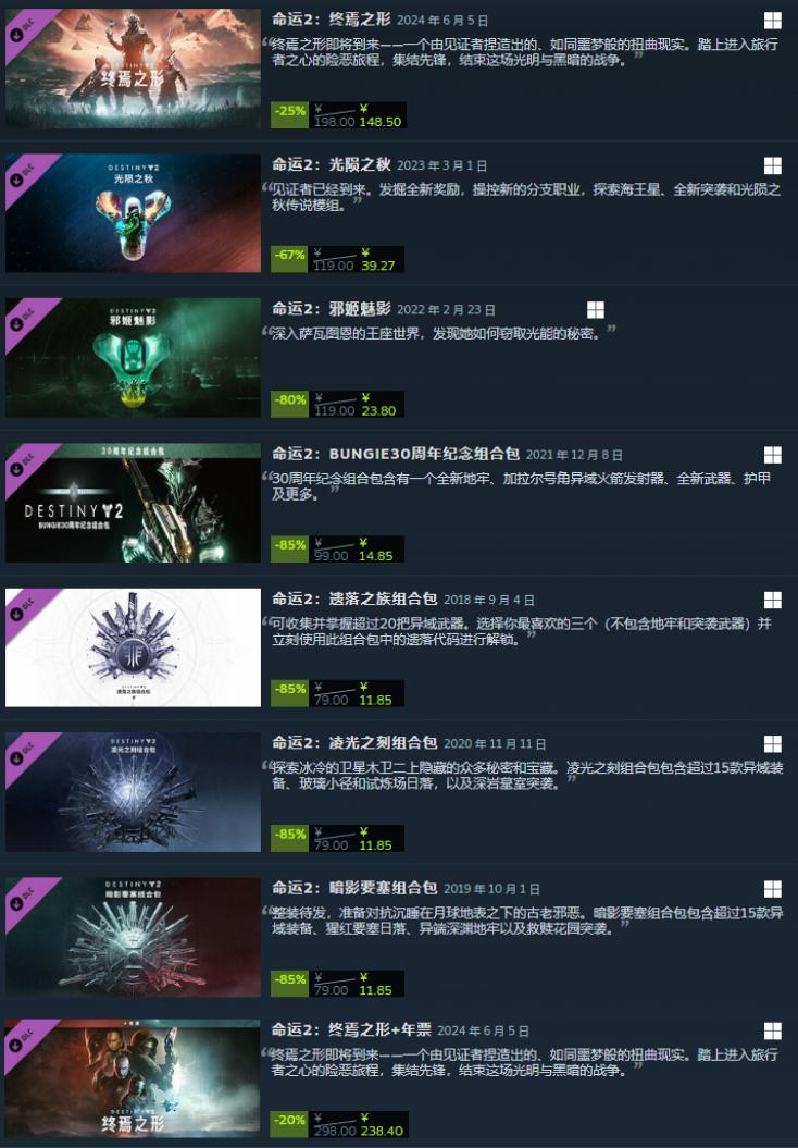 由Bungie制作并发行的FPS大作《命运2》日前迎来了备受期待的年七扩展——《命运2:终焉之形》。近日,随着Steam 夏季大促火爆开启,最新DLC《终焉之形》也迎来首次折扣!《命运2:终焉之形》原价198元,现七五折入手仅需148.5元!玩家还可在Steam平台以新史低八折入手《命运2:终焉之形》+年票组合。《命运2:终焉之形》+年票组合原价298元,现八折入手仅需238.4元!守护者们期待已久的新拓展以更加亲民的价格开放,前所未有的折扣力度让每一位热爱《命运2》的玩家都能轻松加入终焉之形的冒险之旅! 其他DLC优惠力度如下: 《命运2:遗落之族》、《命运2:暗影要塞》、《命运2:凌光之刻》原价79元,现一五折入手仅需11.85元; 《命运2:邪姬魅影》原价119元,现两折入手仅需23.80元; 《命运2:光陨之秋》原价119元,现三三折入手仅需39.27元; 《命运2:Bungie30周年纪念组合包》原价99元,现一五折入手仅需14.85元; 终焉之形已至。守护者们经历在旅行者苍白之心的漫长跋涉,终于能直面见证者,与暗影之声进行最后的决战。为迎战见证者,玩家可在苍白之心的冒险过程中获得三个新的光能超能以及新的星相,并体验《终焉之形》推出的棱镜分支职业和异域武器,不断扩充的军械库亦赋予了守护者更强大的力量。此外,《终焉之形》中传说战役再度回归,新敌人派系“恐惧”和全新突袭“救赎的边缘”也已正式推出。守护者将在游戏中获得新的力量,遭遇新的挑战。 《终焉之形》是光明与黑暗传奇的终结,守护者们已击败见证者并拯救太阳系,《命运2》十年的旅程迎来了辉煌结局。但命运宇宙里的故事还在继续。庆祝和展望光明未来的时候到了,而“回响”就是第一站。在与见证者的巅峰对决后,银河系发生了翻天覆地的变化。见证者已不复存在,守护者们将前往觉醒的涅索斯,探寻新的Vex威胁。常驻Vex专家圣人14号和奥斯里斯将和守护者们一起,借助智能失效保险的全力支持来探索这颗星球,挖掘有关这一新威胁的所有数据。? “回响”将推出三个章节(每个章节长约六周),章节1已于6月12日推出,章节2将于7月17日推出,章节3将于8月28日推出。每个篇章都会为你的旅程提供更有意义的奖励路线和更精彩的武器配装,在遇到各种新老朋友和敌人的同时,也有很多秘密等待被发现。伴随着章节更新,新的任务链、新的活动以及新的奖励将同步开启。每一个章节的活动都会随着时间推移不断扩展,奖励池也会不断扩大。 如果你是FPS游戏的骨灰级玩家,或是想要踏上一场紧张刺激的星际探险之旅,那么千万不要错过此次夏促狂欢!赶紧将《命运2》加入游戏库,成为守护者,开启专属你的传奇冒险! |