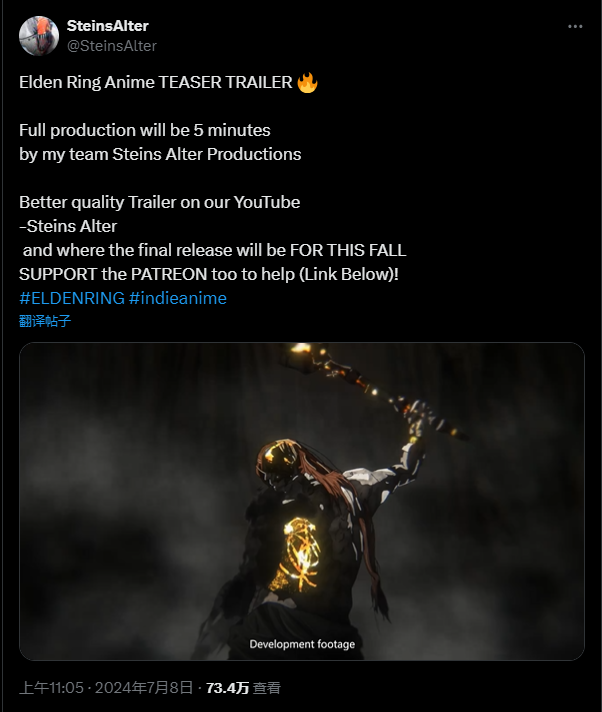粉丝自制《艾尔登法环》动画短片首曝预告 质量颇高堪比官方