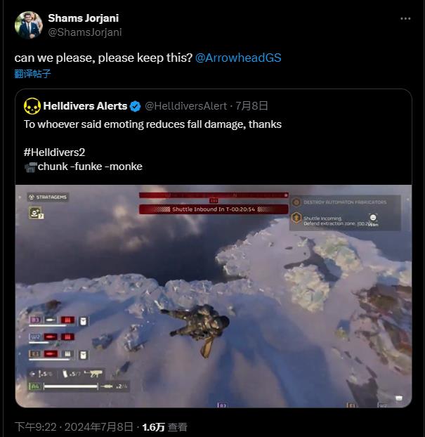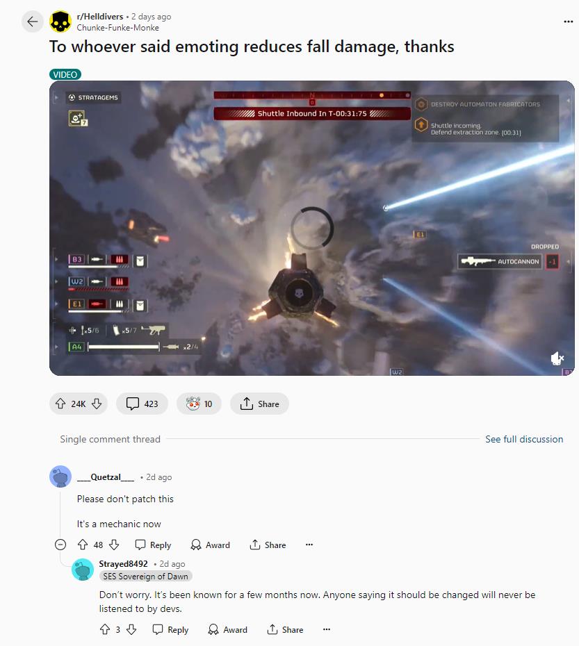 《绝地潜兵2》玩家发现使用表情可减免坠落伤害 请求官方不要修复