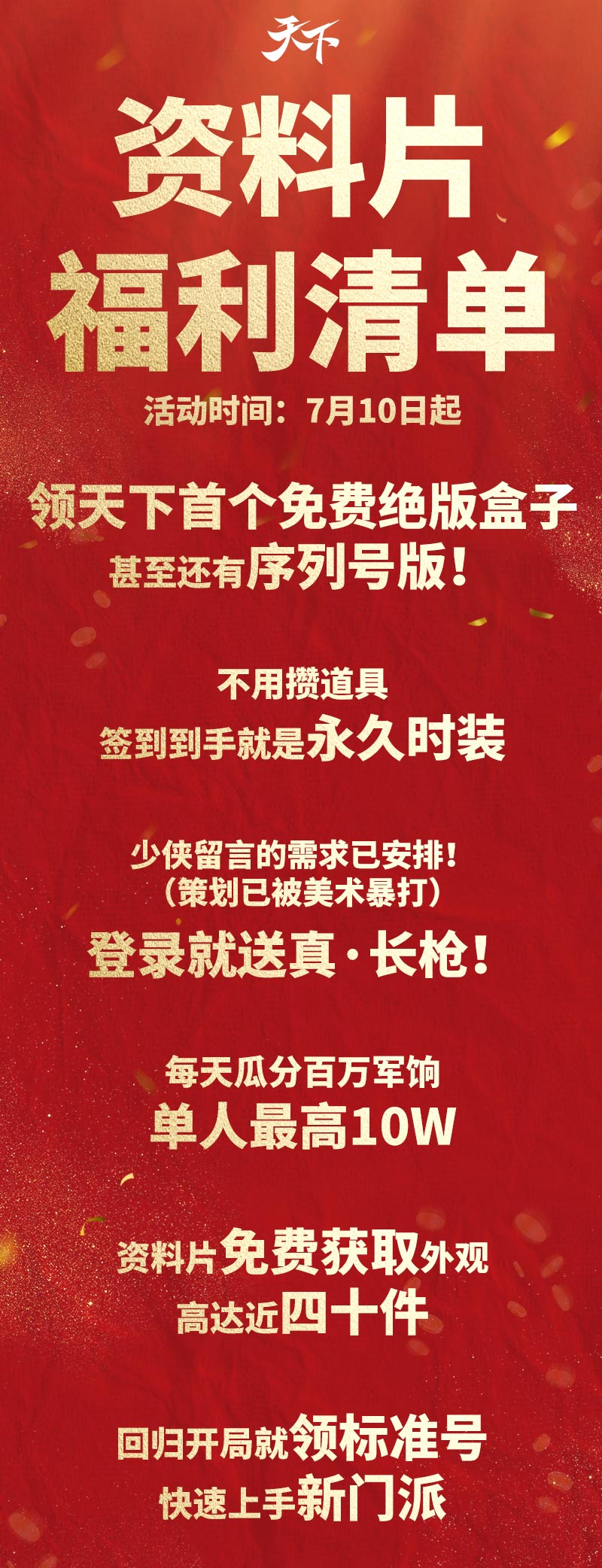今日就是年中资料片【玄海寂途】 新门派【玄溟教】、新地图【龟背岛】 正式上线的大日子了! 资料片期间,正是咱们咱们的 “大荒福利超送计划”首期开始发力 为大家送福利的日子~ 此前已经为大家带来了下方的这张福利清单 但光看这张图是不是还不足以详细了解 自己上线后能获得什么福利? 别着急,小天天早就为大家准备好了 包含大部分福利的长图了! 上线即领【大荒监督官礼】 绝版盒子、拓本武器等好礼 更有从明日起连续28天 瓜分巨额军饷的重磅福利 话不多说,赶快下滑看看吧! 以上仅仅是我们给大家带来海量福利的一部分 更多的福利,欢迎大家上线后亲自体验、获取 与此同时“大荒福利超送计划”也将持续发力 为大家不断送上更多福利 希望能让各位少侠玩得开心、满载而归! 全新的征程已开启 全新的主线剧情、新门派、新地图等 海量新鲜好玩的内容都在等着你! |