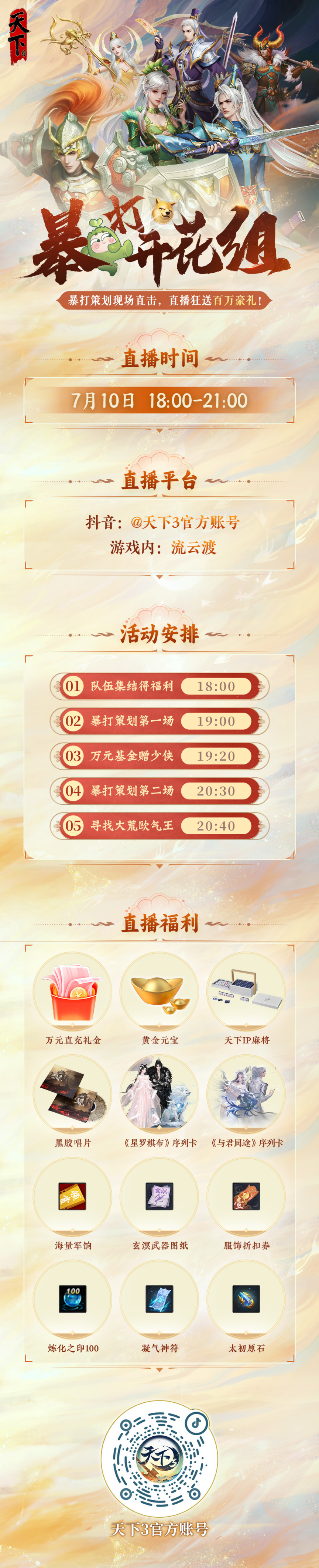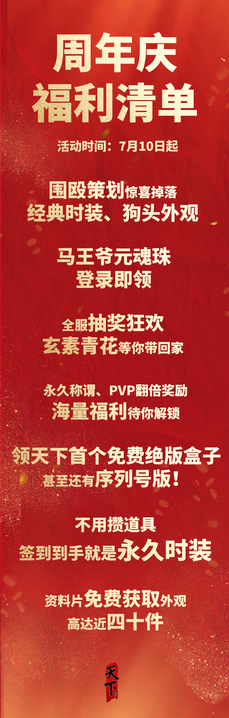 天下贰周年庆典开幕,同时还有年中资料片【玄海寂途】,全新的门派【玄溟教】与你共襄盛典,从去年7月至今,无数少侠奔赴大荒,开启全新的篇章,少侠们的陪伴与热爱支撑着我们不断前行,也是KFZ一直进步的动力,为此,正值周年期间,我们为大家准备了一系列礼物,以及众多丰富好玩有趣的玩法,以回馈各位少侠~,经典时装【蒹葭】【白露】、趣味狗头外观、马王爷元魂珠、永久纪念特效称谓、免费盒子……大量豪礼全都备好,超40+外观不花一分钱就能带回家!还有新门派、新主线、全新大地图【龟背岛】焕新后的钓鱼、挖宝等花样玩法待你体验~就让本天给大家,介绍一下本次盛典内容吧! 掏空家底!多重福利一次性都给你 暴打策划,拾取经典时装、趣味狗头 一直以来,少侠是不是想对策划宣泄一些难以言说的情绪?这一次,我们来满足你!周年庆典到来,KFZ也会加入这场狂欢,7月10日-16日,【暴打开发组】活动火热来袭,策划会化身全民公敌,让你尽情打个够!少侠组团围殴有机会拾取掉落的经典时装【蒹葭】【白露】,扒下趣味“狗头”外观等好礼,你的每一击都可能带来更大的惊喜,打得越狠,奖励越多! 围观“暴打”直播现场,策划代练为你买单 光是围殴还不够爽?还有百万豪礼为你助兴! 7月10日 18-21点,“天下贰暴打开花组”直播开启,在天下3官方账号抖音直播间,我们带少侠围观活动现场,送上百万豪礼,并承包你的全额消费! 届时,不仅有直播间专属礼包码送给少侠,海量军饷、服饰折扣券、玄溟武器图纸、太初原石等海量道具等你领!我们还给大家准备了实体黄金元宝、天下IP麻会、黑胶唱片,星罗棋布、与君同途序列卡等豪华大礼,一起嗨翻天~ 此外,少侠积极参与互动还能有机会获取上号机会,让天下贰策划充当少侠的专属代练,直接给少侠“哐哐”充值,直播为你洗翅膀、开箱子、下战场! 除了在抖音直播间,大家还能在游戏内的流云渡观看现场。感兴趣的少侠不妨点击下方海报,查看更多活动资讯哦~ 幽都妖魔惊喜“返场”,上线即领马王爷元魂珠 去年,无数少侠奔赴太古铜门奋战前线,与妖魔决一死战,其中强敌马王爷给大家留下深刻印象。这一次,他也会惊喜返场,与大家共庆周年!7月10日更新后,少侠登录即领【马王爷元魂珠】,通过流光城、势力战周常任务或竞技场、战场、忘川声望商店,还可以获得用于补充马王爷元魂珠魂魄的【裂片·马王爷】。 珍稀外观、道具?福利商店通通免费换 庆典专属福利商店同步开业,各种奖励琳琅满目,势必让你满载而归!参与一系列庆典活动,大家可以获得节日声望,在商店内兑换海量豪礼!全新饰件【高山流水】、时装、炼化之印、羽灵珠、太初原石各种珍稀道具等你带回家~ 谁是下一个欧皇?玄素青花等你来 精彩何止这些?重磅抽奖席卷全服,掀起下一波狂欢热浪!大家每日通过完成庆周年系列任务、每日活跃宝箱、暴打KFZ等玩法可获得天、下、贰三种道具,集齐三种道具便能兑换抽奖券,参与全服抽奖狂欢!玄素天成·时装、黛染青花·时装、星罗棋布实体礼盒、与君同途实体礼盒、天下x罗技联动款鼠标等豪礼早已备好,就等你来~ 永久称谓人人领,奖励翻倍燃激情 一年光阴荏苒,无数少侠重返大荒共历山海征程,感谢大家的陪伴与热爱! 全新永久特效称谓【高山流水曲尚酣,岁岁朝朝且同欢】邀你上线共庆天下贰庆典,活动期间,少侠只需完成三天日常任务,即可免费领取称谓奖励。与此同时,战场的号角亦随盛典吹响!竞技场、战场奖励翻倍,加码福利嘉赏诸位英雄~ 不花一分钱!免费绝版盒子登录即领 首个免费盒子华丽上线,不需要花一分钱,登录即领!少侠参与相关活动更可会免费盒子升级为可逐渐升值的序列号版! 开启盒子可获得永久时装【朝日葵缘】/【暗夜繁花】/【星海流霞】,90天公共时间坐骑【素风萦絮】、永久动态称谓、神农百草集*5等奖励,无论是自用还是珍藏都极具价值哦! 不氪不肝直升永久!永久时装签到即领 活动期间,参与每日签到即得永久时装【彩霞飞绸】,少侠上线动动手指,就能把免费外观收入囊中! 时尚达人狂喜!40+外观免费送送送 在年中资料片【玄海寂途】中,少侠还可以免费获得超40款外观,包括全新的时装、坐骑、饰件、称谓、小宠等,通过签到、节日声望兑换,探索龟背岛等途径就能带走!各位热衷于时尚搭配的大荒“潮人”们记得上线参与,把这些外观通通打包带走咯~ 看到这里的少侠,本天还为你带来一张福利海报,汇总了接下来可收获的所有奖励,不妨收藏起来以便查看哦~ 丰富多元玩法来袭,邀你解锁海量惊喜 新门派、新主线待你体验 全新门派【玄溟教】正式登上大荒舞台,搅动天下风云!这一以长枪为武器,以秘螺为副手的门派,掌握人无我有的特殊能力,其三系技能各有专攻,物理输出、法术输出、辅助流派等各玩法任君选择!超高机动性、瞬发治疗技能等特点相信会为大家提供更加自由灵活的玩法,让我们一起期待下新门派的到来吧~ 随着玄溟回归,新的故事亦将展开,不知在这段崭新的旅途上,少侠又会遇到哪些人,面临怎样的挑战又收获怎样的精彩呢? 新地图【龟背岛】揭晓,丰富多元玩法等你一探 秘螺幽幽,海浪涛涛,【龟背岛】也会随新门派的问世,重新浮现在大众的视野,这片比太古铜门还要广袤的土地,不仅拥有绮丽的美景风光、掩埋着许多不为人知的历史,还隐藏了更为多