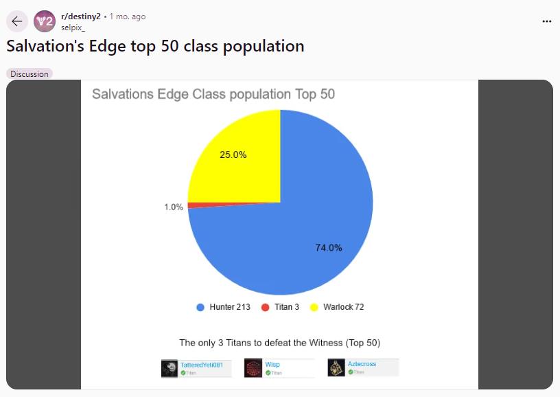 自从《命运2》的最新资料片“终焉之形”发布,三大职业之一的泰坦被普遍认为是最弱的职业。而开发商Bungie最最近的一次开发者直面会上透露,将对泰坦进行职业增强。 直面会上提到泰坦碎日者天赋的大招“烈阳之锤”将得到伤害强化,此外泰坦虚空天赋的全新超能“暮光军火”的射程和伤害也将得到强化。 虽然有玩家也抱怨了棱镜泰坦的强度,但官方并未透露相关的强化,但开发人员表示他们正在密切关注该职业,以了解未来可能的变化。 据reddit用户“selpix_”提供的数据来看,在完成“终焉之形”团队突袭的前50支队伍中,只有3名玩家使用了泰坦这个职业,这代表300名玩家中只有3个是泰坦,使用率可以视作1%。而反观猎人玩家的占比则达到了74%,足以说明《命运2》目前的平衡存在问题。 |