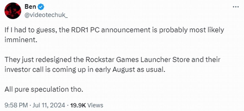 《荒野大镖客:救赎》是R星最成功的作品之一,尽管该作在13年前就已发售,但许多粉丝仍期待其PC移植版的到来。早先有消息称,R星在开发《荒野大镖客》PC版,但不会很快公布。几个月后,官方似乎将宣布这款PC版。 近日游戏博主videotechuk_发推文称,《荒野大镖客》PC版或将很快公布。最近R星重新设计了PC启动器,新的用户界面突出显示了工作室经典作品列表,而《荒野大镖客》正好与之相吻合。其次,Take-Two即将召开投资者电话会议,《荒野大镖客》PC版可能在8月份电话会议前后公布。 最近Epic Games泄露的消息也显示,《荒野大镖客》PC版开发工作正在进行中。至于发售日期,粉丝们猜测PC版将在今年8-9月推出,敬请期待! |