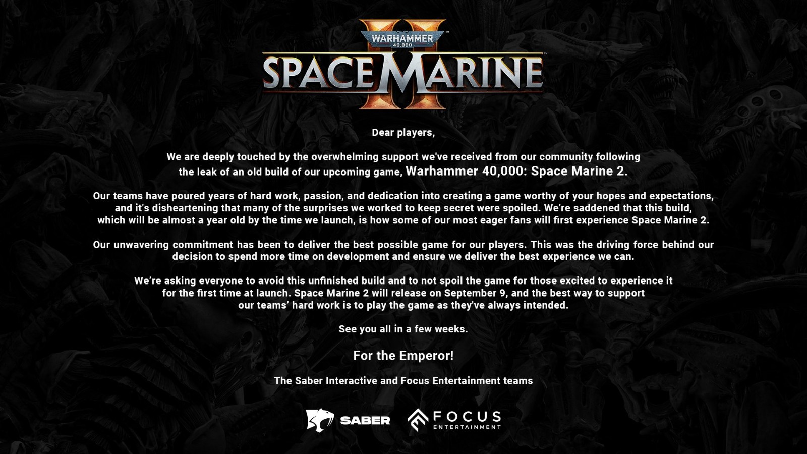 距离发行还不到两个月,Sabre Interactive 的《战锤40K:星际战士2》的某个预发行版本突然在互联网上流传。尽管该版本包含一些占位信息并且整体需要打磨,但其内容足以通关,这无疑导致了剧透和游戏玩法泄露。开发商和发行商 Focus Entertainment 此后通过推特发表了评论。 “我们的团队倾注了多年的辛勤工作、热情和奉献精神,创造了一款值得您希望和期待的游戏,令人沮丧的是,我们努力保守秘密的许多惊喜都被破坏了。我们感到遗憾的是,这个泄露版本到我们发行游戏时实际上已经有一年历史了,而它却成为我们一些最热切的粉丝首次体验《星际战士2》的方式。” 目前,Sabre Interactive和Focus呼吁粉丝们在游戏于 9 月全球发行之前不要提前体验未完成的版本,不要进行剧透。 “支持我们团队努力工作的最佳方式就是按照他们一直以来的意图进行游戏。” 《战锤40K:星际战士2》将于9月9日登陆Xbox Series X/S、PS5和PC平台。该游戏上周已经完成了开发,并且分享了一些新的截图。原计划进行公开测试版,但开发商为了优先确保“在发行时提供最佳体验”,测试版已被取消。 |