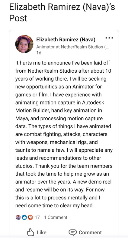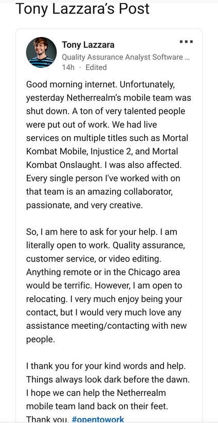 《真人快打》、《不义联盟》等格斗游戏的开发商 NetherRealm Studios 目前发生了大规模裁员,整个移动团队都被解雇。 论坛 ResetEra 用户 Turnscr3w 最先发现了裁员,领英上出现许多员工发布的帖子表示自己将被解雇,团队也将被解散。 QA 分析师 Tony Lazzara 发帖写道:“早上好,互联网。不幸的是,昨天 NetherRealm 的移动团队被关闭了。大量很有才华的人失业了。” 动画师 Elizabeth Ramirez 则分享到:“在 NetherRealm Studios 工作了约 10 年后,我被宣布解雇,这让我很受伤。” NetherRealm 隶属于华纳兄弟游戏公司。目前华纳兄弟游戏和 NetherRealm 尚未回应媒体的置评请求。 此次裁员至少影响了 50 名开发人员——这使得今年游戏行业的失业人数达到将近 1.1 万人。 |