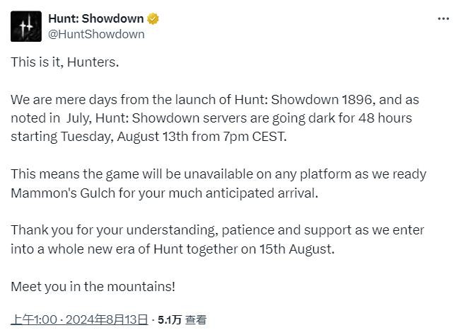 8月13日,《猎杀:对决》宣布将于北京时间8月14日凌晨1点开始停服维护,这意味着届时游戏将无法在任何平台上使用,服务器预计将关闭48小时,以为新版本《猎杀:对决1896》做准备。