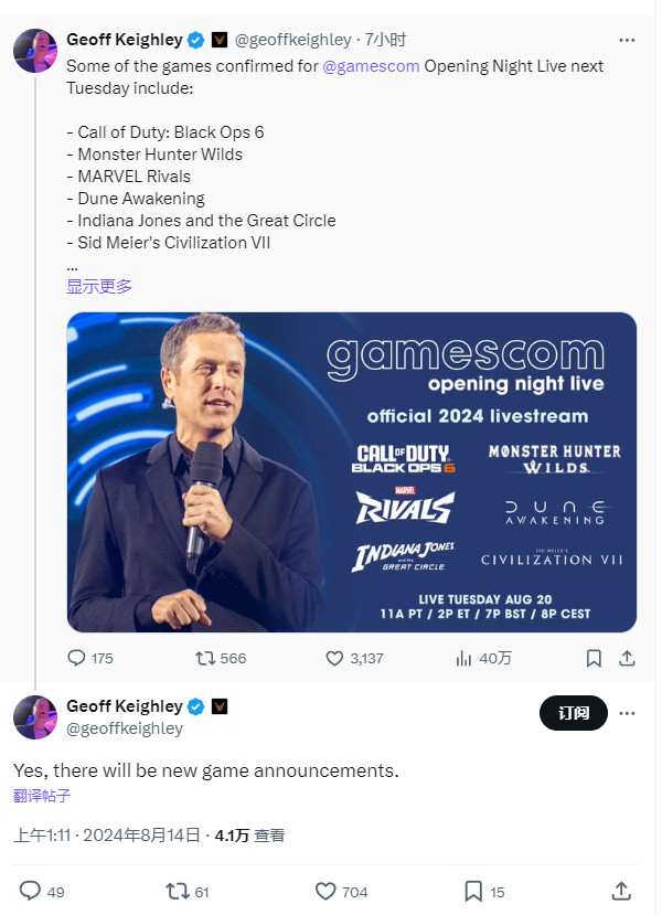 制作人Geoff Keighley确认科隆展开幕之夜直播将会有多个新游戏公布,并不全是已公布游戏的展示。此前世嘉明确表示,他们还有一个尚未公布的新作将在科隆展上提供试玩。
