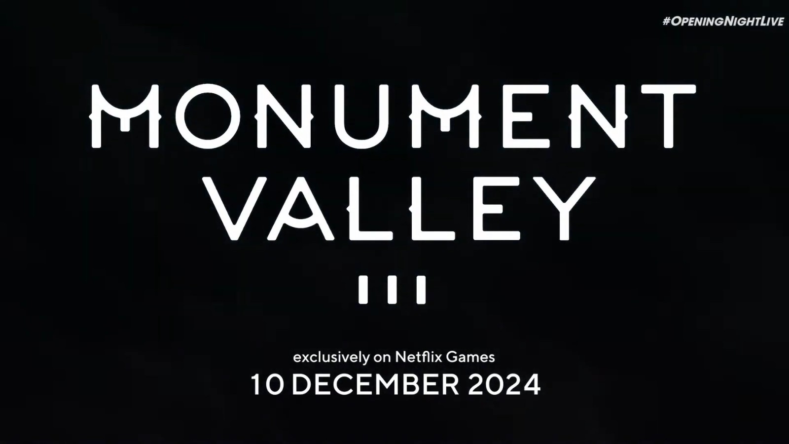 在今年凌晨的科隆游戏展开幕夜直播上,系列新作《纪念碑谷3》正式公布,官方发布了全球首爆预告,宣布游戏将于12月10日发售,登陆iOS和安卓,Netflix游戏平台独占。