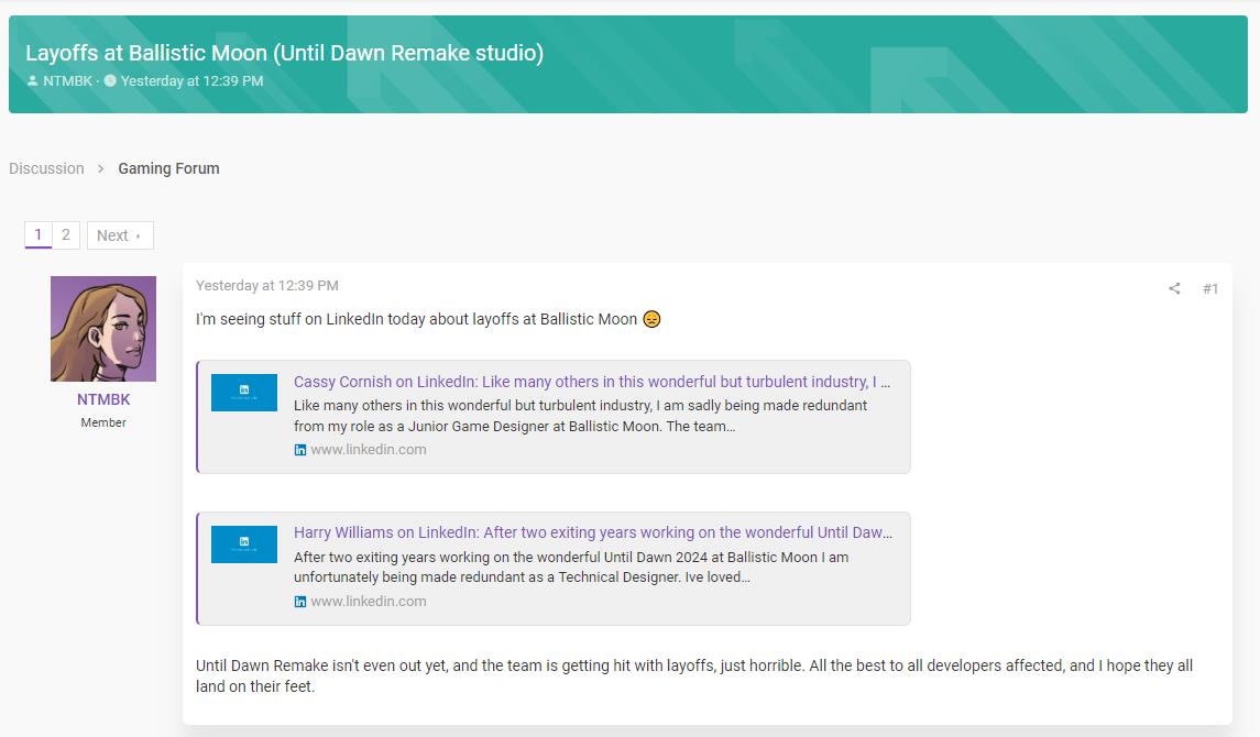 由Supermassive Games开发的一款恐怖动作游戏《直到黎明》,最初在2015年8月独占登录PS4平台(发行方为SIE)。 此前SIE已经公布了将由英国工作室Ballistic Moon负责《直到黎明 重置版》的开发,并且宣布游戏会在2024年10月4日登录PS5和PC平台。 不过在近日外媒“Eurogamer”发现,隶属于Ballistic Moon工作室的两名开发人员在领英上宣布了自己被裁员的消息。其中一位名叫Cassy Cornish的设计师表示:“与这个美好但动荡的行业中的许多人一样,我很遗憾地被Ballistic Moon解除了初级游戏设计师这一职务(同时也遭到了解雇)。” 而另外一位名叫Harry Williams的设计师则遗憾地说:“在为Ballistic Moon的《直到黎明 重置版》项目工作了两年之后,很不幸,我被解雇了,不再担任技术设计师。” Ballistic Moon官方目前尚未对此表态,但游戏尚未推出便出现裁员的情况,的确会让玩家担心游戏的进度和质量是否会受到影响。 |