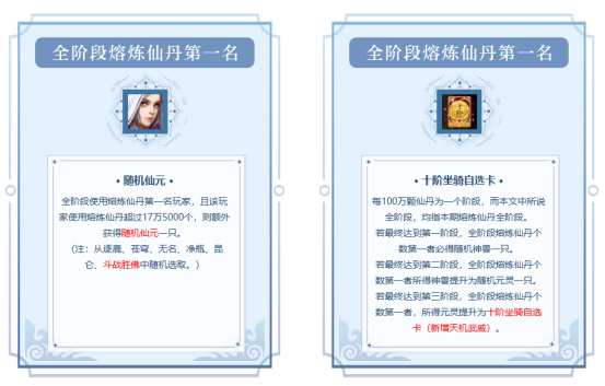 随着九月的到来,天气逐渐转凉,但各位道友们的热情却丝毫未减。在这个充满期待的季节里,《问道》电脑版九月的全新活动如期而至,为大家带来了诸多惊喜和福利,一起来看看吧。 一、【熔炼仙丹】(普通版)天机武威金秋送爽,至尊巨骨刺雄浑刚劲 活动时间:2024年9月1日- 2024年9月30日 领奖时间截止至2024年10月3日 9月熔丹盛典如期开启,天机武威继续保驾护航,熔丹奖池扩充至四个阶段,万千好礼,聚焦九月熔炼仙丹! 活动期间,全服等级满40级的玩家均可参与活动,熔炼次数不限,既可单次体验,也可批量熔炼。每一次熔炼,都有机会获得随机数量的道行或经验奖励,还有机会获得元灵、相5首饰、随机十阶坐骑等珍稀大奖,此外还有机率获得至尊巨骨刺、罴九、翻羽、海量银元宝、元灵、点化羽化完成英招、神兽+80级相3首饰、六阶坐骑雅尘狐、80级相4首饰、商城道具等奖励。。 同时,全阶段熔炼仙丹第一名将获得额外大奖: 每100万颗仙丹为一个阶段, 若最终达到第一阶段,本期全阶段熔炼仙丹个数第一者必得随机神兽一只。 若最终达到第二阶段,本期全阶段熔炼仙丹个数第一者将所得神兽提升为随机元灵一只。 若最终达到第三阶段,本期全阶段熔炼仙丹个数第一者将所得元灵提升为十阶坐骑自选卡(新增天机武威),任意十阶任君挑选。 为了回馈玩家们的热情参与,本月的熔炼仙丹活动将扩充为四个阶段,第一阶段前四和第二、三、四阶段前三名的玩家均有机会获得机关宠·鲲鹏和随机八阶坐骑奖励。 二、【万宝阁】(普通版)仙元苍穹霸天下,东山神灵战群魔! 活动时间:2024年9月1日 - 2024年9月30日 钜惠狂欢不停歇,实惠道具福利送。普通版的玩家在活动期间单笔充值满1000元宝即可获得1枚符钱道具,符钱道具需在游戏内活动界面处领取,玩家可至居所管家处,提交符钱道具兑换道行奖励(每日限10枚符钱),也可以右键直接使用符钱,抽取万宝阁中的道具,每次抽取必定有道具奖励,9月活动奖池更新,将迎来三天技仙元苍穹、三天技元灵祸斗、夫诸、三天技神兽疆良、穷奇、东山神灵等强力伙伴,心动不如行动,赶快试试手气。 另外不喜欢随机抽取的道友也可以花费指定数量的符钱在万宝阁中兑换指定的道具,奖励包括各类珍贵道具、法宝、各式秘籍等。 三、【十元一抽】(经典版、时间版)巨骨刺,帅帅猴,极品宠物入我手 活动时间:2024年9月1日 - 2024年9月30日 披荆斩棘巨骨刺,机灵聪慧帅帅猴!本月十元一抽活动即将迎来深受大家喜爱的的8阶御灵坐骑巨骨刺,三/二天技蓐收、句芒、帅帅猴等极品宠物,更有神兽精魄、变异精魄、特级归元露、特级点化丹等奖励。 经典版用户有机会赢取高级道具套餐卡、道具套餐卡等超值道具大礼包,而时间版用户则有机会获得超级绿水晶、无忧套餐卡、天道神符等豪华道具奖励。 在活动期间,每充值10元(含)以上的光宇币,并将其兑换为问道元宝,即可获得一次抽奖机会。若单次充值满100元,更可额外获得一次大额抽奖机会!前往天墉城的“南极仙翁”处,即可直接参与抽奖并领取奖品。 四、【分宝崖】(经典版)奇珍秘藏紫气升腾,瓜分至宝快乐翻倍 活动时间:每月1日0:00:00至10日23:59:59开启活动 活动期间,凡经典版服务器内角色等级达到或超过60级的玩家,均可参与活动。海量奖品等您来赢取,包括相性首饰、轮转玉、高阶坐骑、限量版神兽、珍稀变异宠物、稀有属性天书、附带属性的黄水晶、浮生结晶以及银元宝等丰厚好礼,惊喜连连,不容错过! 在游戏内主界面右上角点击“分宝崖”活动小图标,打开活动面板,点击左侧【奖励说明】按钮,可打开奖励概率说明界面;点击界面中【X色宝物】可打开查看该阶段的详细奖励内容;活动参与方式可以选择【分宝1次】和【分宝10次】。通过“返利详细”可查看累积分宝次数,以及对应的阶段奖励及排行奖励。 五、【道行基金】(经典版、普通版)进行中,勤于刷道领元宝 基金购买时间:每月1日00:00-11日23:59 道行统计及奖励领取截止时间:每月最后一天的23:59 随着月初的到来,各位道友再次迎来了刷道的热潮,别忘了参与本月的道行基金活动!通过勤奋刷道,就有机会获得双倍的银元宝奖励,惊喜不断! 只要在本月活动期间购买了道行基金,并成功将道行提升至指定级别,便能领取相应的银元宝奖励。请注意,每项奖励在活动期间仅限领取一次! 六、【游戏币许愿】(经典版、普通版)神奇许愿树,天天送惊喜 活动时间:每月1号00:00至每月最后一天23:59 神奇许愿树,帮您得偿所愿。活动期间,玩家前往许愿树(天墉城121,87)与其对话,可花费游戏币(非代金券)购买许愿仙豆。拥有许愿仙豆的玩家在许愿树处可以许愿,许愿成功后可以获得丰厚奖励! 经典版的玩家许愿成功后有机会获得八阶坐骑太极熊、六阶坐骑古鹿、北极熊、改头换面卡、神兽精魄、变异精魄、道具套餐卡、无量心经、超级粉水晶、超级女娲石等海量奖励。 普通版的玩家许愿成功后有机会获得至尊太极熊、至尊巨骨刺、至尊玉蝶鱼、至尊盘古猿、元灵精魄、改头换面卡、超级女娲石、五雷令等奖励。 《问道》电脑版九月活动精彩纷呈,丰厚奖励琳琅满目,希望每一位道友都能抓住夏天的尾巴,在这个初秋幸福满满,游戏人生双丰收。 |