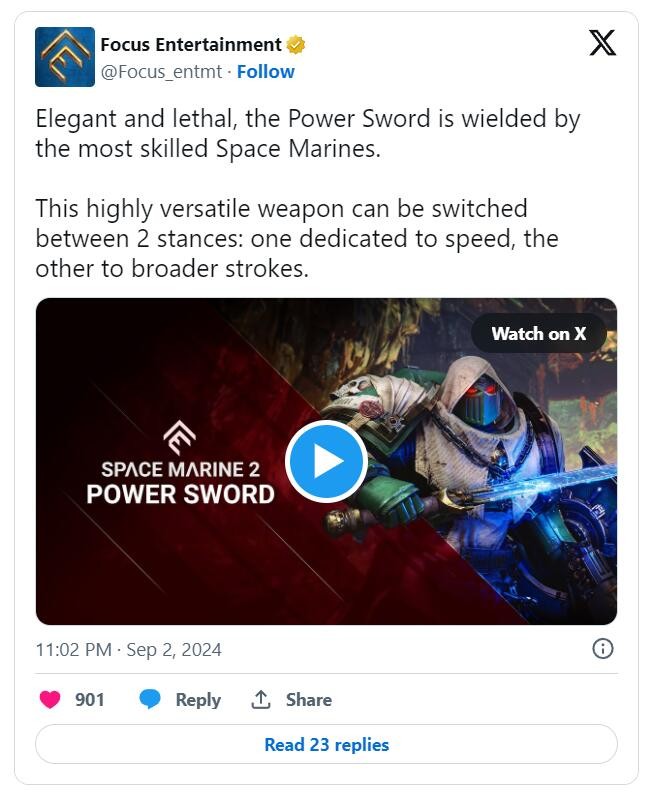在《战锤40:星际战士2》中,玩家可以使用帝国各种致命的武器,虽然其中大多数显然会是枪械和远程武器,但《星际战士2》也包含一些砍杀元素,这意味着玩家们还会找到一些近战武器。发行商Focus Entertainment现在已经重点介绍了其中的某个代表武器。 工作室分享了一段新预告片,展示了动力剑,这是一种优雅但致命的武器,可以有效地用来砍杀和撞击泰伦虫族。动力剑还允许玩家在两种姿态之间切换,一种侧重于速度,另一种则让你进行更慢但更广泛的攻击动作。请查看下面的实机展示,看看这把武器的实际表现。 《战锤40:星际战士2》将于 9 月 9 日在 PS5、Xbox Series X/S 和 PC 上推出。 视频截图 |