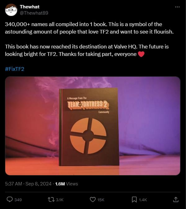 由Valve开发的第一人称团队竞技射击游戏《军团要塞2》自2007年10月便已面世,至今仍受到许多玩家的喜爱。不过游戏在近年来饱受作弊外挂和机器人账号的侵扰,也因此引发了玩家们的不满。 虽然常年“度假”的V社在前段时间出手整治过相关问题(当时效果显著),但没过多久大量的机器人账号卷土重来,令《军团要塞2》的玩家不堪其扰。 于是最初在2022年诞生的“#SaveTF2”活动的全新请愿“#FixTF2”(该请愿书在今年6月便已获得20万人次的签名支持)又再次得到了大量玩家的响应,目前已有超过34万名玩家联名请愿。 而这一次活动组织者“TheWhat”将请愿者的名字都印刷在了一本装订成册的精装实体书中,上书“来自《军团要塞2》社区的一则讯息”,并将其送往了V社的华盛顿总部。 虽然目前尚不知晓这本联名请愿书是否完全进入到V社的内部,但其代表的《军团要塞2》玩家们不屈的精神着实令人钦佩。 |