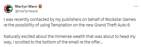 随着时间的推移,曾被冠以“xx出品,必属精品”名头的游戏厂商们大多跌下了神坛,唯有R星依然保持着极佳的进取势头。虽然开发游戏的速度偏慢,但玩家们依然愿意为一款精品游戏而等待。而在2025年,大家就将迎来《GTA 6》的发布。 吸取了CDPR在《赛博朋克2077》发售前夕公布的内容过多,给予玩家期望过高的教训,R星对《GTA6》的宣发一直都很低调,你鲜有听闻关于这款游戏太多的消息。然而近期,《GTA6》却在网上引发了一场纠纷,原因是R星想要买一支歌却没能谈拢价格。 事件始建于 Heaven 17 乐队的成员Martyn Ware发布的推特动态,他表示R星打算在《GTA6》中使用他们乐队的单曲《Temptation》。这首歌发布于40年前,不过并没能达到风靡全球的地步,所以国内玩家知道的应该不多。 考虑到R星公司的雄厚实力,Martyn Ware原本以为可以收到一笔巨款。不过,R星最终只愿意给出7500美元的买断费,这让他大为光火。直接在推特动态中使用了F开头的单词,因为他认为《GTA6》能赚86亿美元。 关于Martyn Ware如何得出了《GTA6》能赚86亿美元这个结论,大概率是因为这个系列此前所取得的惊人销量数据。作为全世界销量最高的游戏系列之一,光是《GTA6》的前作就卖出了超过2亿份。所以Martyn Ware才认为,7500美元的价格低了。 后续又有人指出,7500美元是给三人乐队成员每个人的报价。所以合计应该是22500美元,但还是没有得到Martyn Ware的应允。他依然觉得,这笔钱对比《GTA6》所能收获到的利润仍是九牛一毛。 期间,也有不少网友劝诫Martyn Ware接受这个报价,认为这首歌出现在《GTA6》游戏里,可以大幅提升知名度和曝光率,但还是遭到了Martyn Ware的拒绝。究其原因,他认为自己并不缺这些。 老实说,站在Martyn Ware的角度考虑,R星的买断费用确实有些偏低,可R星也有自己的考虑。毕竟音乐作为现代游戏的重要组成部分,在《GTA6》中的具体应用,究竟是电台中的曲目?还是某个章节获任务的特定BGM?所占的戏份是不一样的。 如果都按这个标准来给歌手支付报酬,R星光是为游戏花的买断费用都得达到数百万美元,这显然不符合正常的游戏开发成本的范畴。按照事件目前的发展趋势,不出意外的话这项交易将会被搁置。 只是,R星过去就曾有将自己不对付的人和事,放在游戏中进行的讽刺的习惯,《荒野大镖客2》中就有对女权组织和动保人士的影射。保不齐这起事件,接下来会成为《GTA6》游戏中某个支线任务也说不定。 那么大家对此又有什么想说的呢? |