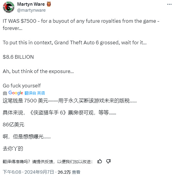 嫌便宜 R星花7500刀为GTA6买歌遭拒:你们卖游戏能赚86亿