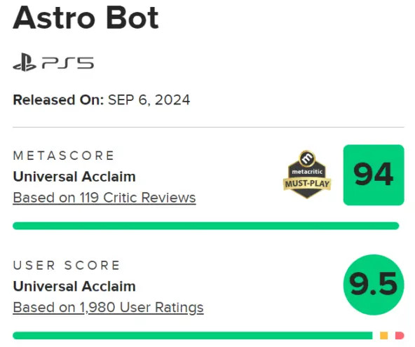 今日(9月11日),冒险游戏《宇宙机器人》在评分网站Metacritic玩家评分解禁,该作收获近?2000 条评论,综合评分为9.5分(10/10),目前为止是2024年发售的游戏中最好成绩,超过韩国动作游戏《星刃》。 《宇宙机器人》在Metacritic上的游戏媒体评分为94分(100/100)。这是2024年游戏中的第二好成绩。排名第一的是《艾尔登法环》的DLC《黄金树之影》- 95 分。第三名是《最终幻想VII 重生》-92分,前3名中有两款 PS5独家游戏。 《宇宙机器人》于9月6日发布。该游戏也成为PS Store上评分最高的游戏之一,得分为4.94(满分5分)。 在《宇宙机器人》中,玩家可以探索6个星系和超过80个关卡,寻找Astro散落各处的船员。 游戏让玩家深入体验每个独特的星球,包括茂密的丛林、沙滩、炙热的火山,还有令人惊艳的地点,如巨大沙漏和歌唱树的树冠。 游戏中还新增了 70 多种新型敌人,包括每个星系的终极大头目。 |