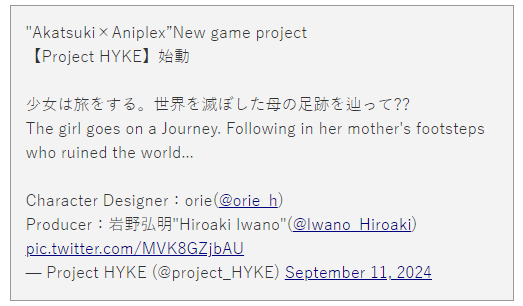 9月11日今天,Akatsuki×Aniplex共同宣布联合推出游戏新作策划《Project HYKE》,同时放出了疑似女主角的新艺图,敬请期待后续消息。