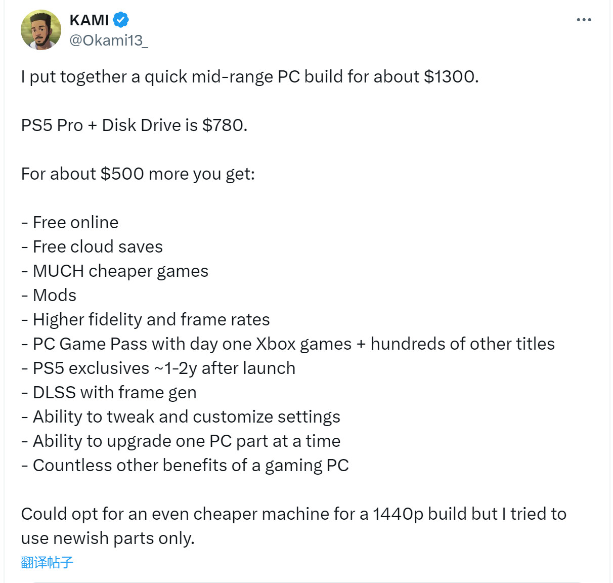 PS5 Pro 700美元的定价被玩家骂惨了,X上出现了关于PS5 Pro vs PC的讨论。知名游戏推主Okami13_表示自己大约花了1300美元快速配了一台中端PC,虽然比PS5 Pro还贵,但却能换来许多实实在在的好处。 他说PS5 Pro+光驱加起来是780美元,PC比其贵了500美元,但这多出来的500美元你却能得到: 免费在线(PS在线联机要收费) 免费云存档 便宜太多的游戏 MOD 高分辨率和帧率 PC Game Pass首日Xbox游戏+成百上千的其他游戏 PS5独占游戏(发售1-2年后) DLSS和帧生成 能调节画质设定 能随时升级一个部件 数不尽的其他优点 其实如果是为了2K游戏,PC的价格还能再便宜一点,但我仅尝试使用最新的配件 网友反应: 有了模拟器,就能免费玩PS1,PS2和PSP游戏 最重要的一点:PC到PC相关的事情 不要忘了驱动更新,优化差和兼容性问题哦 PC Game Pass从啥时候开始免费了?(PC Game Pass也是要收钱的) 很多主机玩家已经有了电视和其他设备,而你没有算上显示器,鼠标,音响 |
