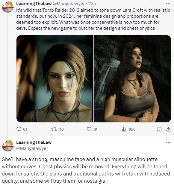 近日游戏博主LearningTheLaw发推文称:“2013年《古墓丽影9》曾尝试让劳拉形象更贴近现实,在当时这很前卫。然而在2024年,其女性化设计和身体比例却被认为过于露骨。曾被视为保守的东西,现在对开发者来说太过分了。预计在新作中,劳拉的角色设计和胸部物理效果将被修改。”