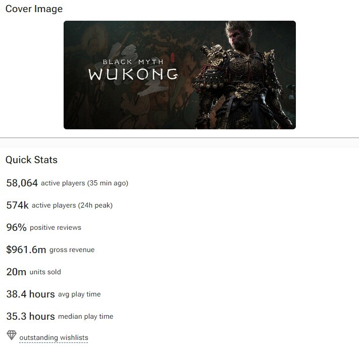 《黑神话:悟空》已发售满一个月了,今日(9月20日)据VG Insights数据显示,《黑神话》Steam版销量已达2000万份,达到新的里程碑。 据悉,《黑神话》在Steam平台的销量已达2000万份,总收入超过9.61亿美元(约合人民币67.9亿元)。 值得一提的是,《黑神话:悟空》发行平台除了Steam平台外,还包括WeGame、PlayStation和Epic平台。有机构预测,该作全年销量有望达到3000万-4000万份。 《黑神话:悟空》是由游戏科学团队制作并开发的一款西游题材的单机动作角色扮演游戏,此团队先前制作过《百将行》、《战争艺术:赤潮》等优秀作品,在这款全新作品中,团队使用顶尖的画面,丰富的打击等多方面要素,还原了一个最真实的西游世界。 |