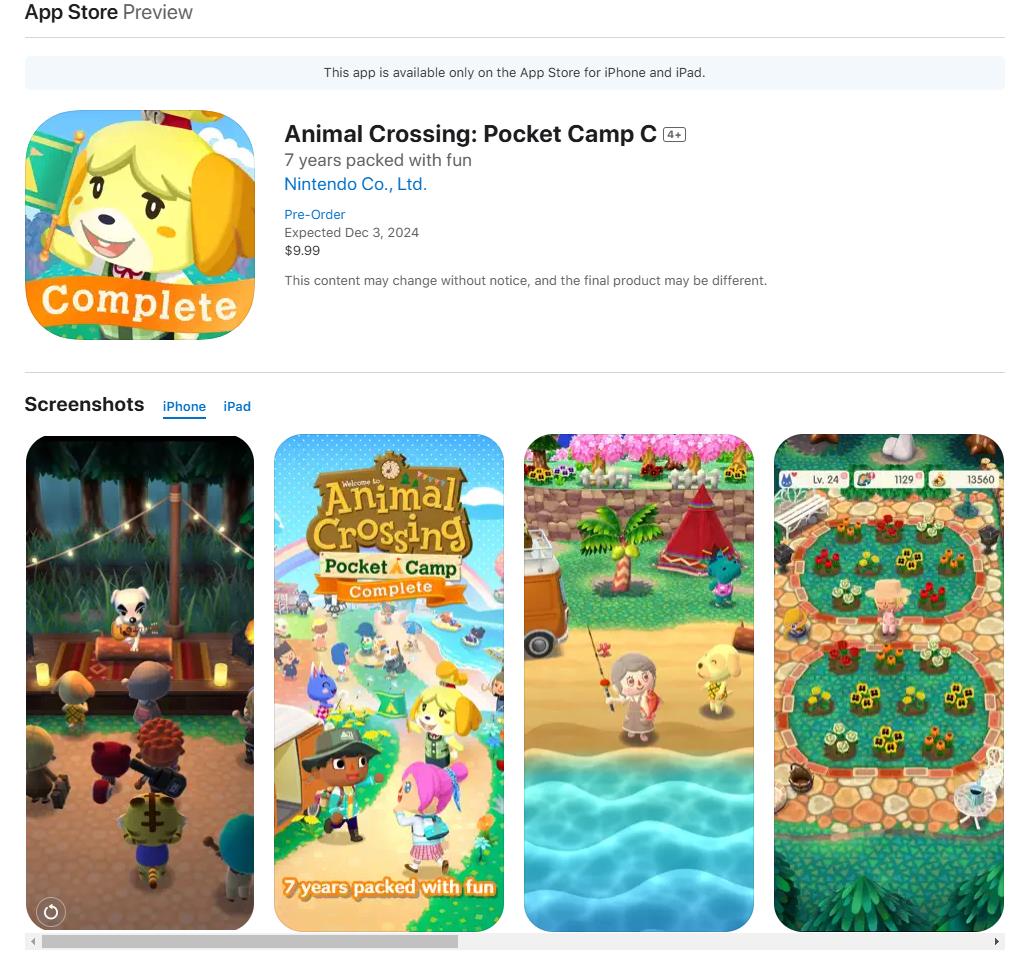 任天堂打造的手游《动物森友会:口袋露营广场》最初在2017年11月21日上线iOS和安卓,此前曾宣布将于11月29日正式停服。 不过任天堂方面还宣布会在《动物森友会:口袋露营广场》停服后推出买断制版本的同款游戏,玩家可通过绑定Nintendo Account来继承之前的存档数据。 近日任天堂正式公布了买断制《动物森友会:口袋露营广场集合版》的上线时间,将于2024年12月3日登录iOS和安卓平台,目前已在双端的商城页面上线,并提供事前登录和预定,目前预定价格为9.99美元(iOS端,约合人民币71.3元)。 需要注意的是,虽然《动物森友会:口袋露营广场集合版》也会继承游戏原版的季节活动等内容,但由于取消了在线服务,因此不会由任何的内购或订阅,市集和好友交换功能也被删除,此前的叶子票券同样被取消。 |