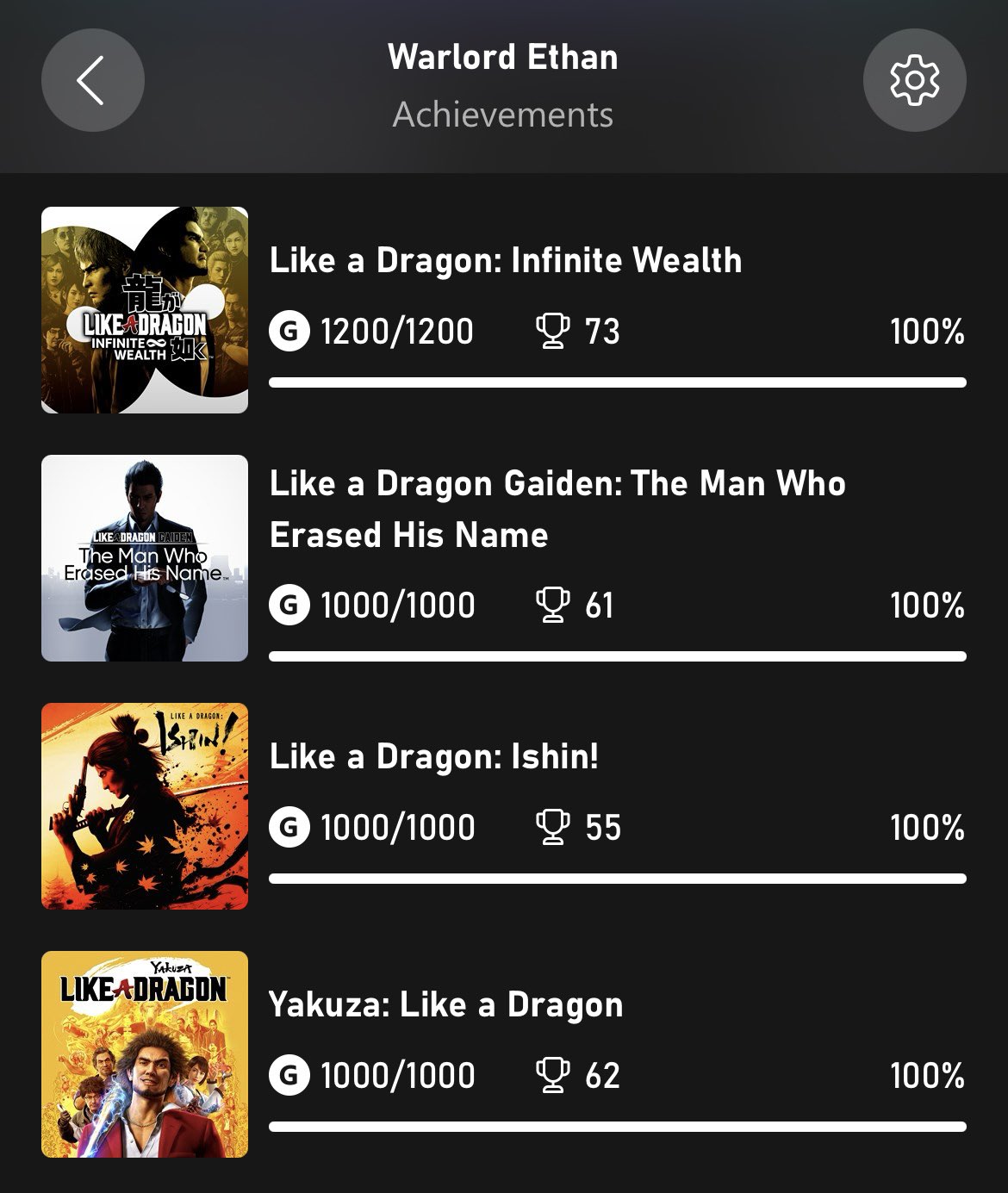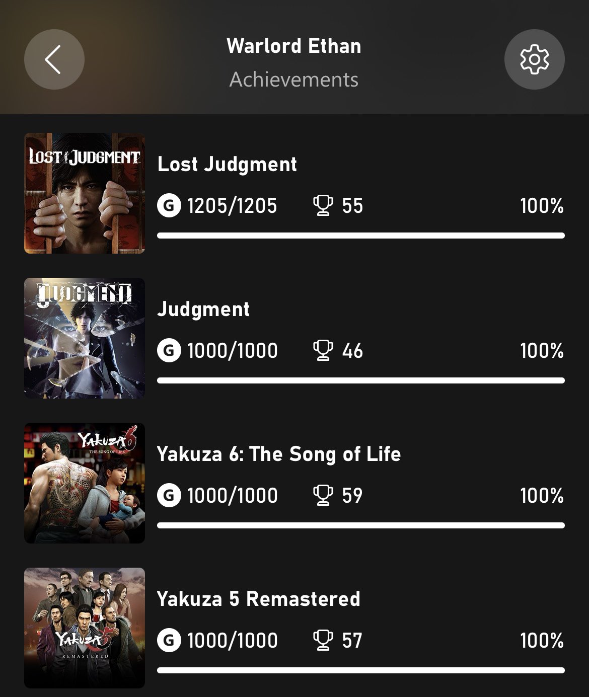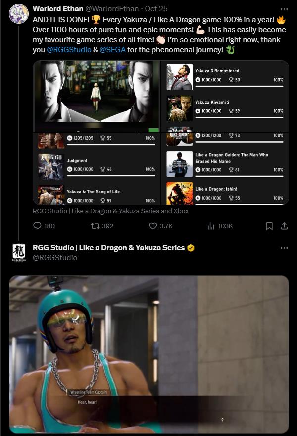 《如龙》真人剧现已上线亚马逊Prime Video,不过本作并未获得观众和媒体的认可,IGN甚至给出了4分的不推荐评价。 不过《如龙》系列的粉丝玩家可能更关注的还是游戏作品,例如最近完成了1年内全部100%通关系列游戏成就的玩家“Warlord Ethan”。 该玩家在推特上晒出了他的XboxGamerscore统计截图,其中可以看到包含《审判之眼》和《如龙:维新!极》在内的共计13款“如龙”系列游戏,都达成了100%全成就通关。 而根据“Warlord Ethan”的说法,他在1年内花费了超过1100个小时才顺利完成,并且还赶在了《如龙》真人剧上映之前。 这样的壮举不仅令“如龙”的粉丝们感到惊讶,连《如龙》系列的制作团队RRG Studio都赶来为其“祝贺”。RGG Studio用一段视频回复了推文,在视频中Infinite Wealth田径队的多名成员为他的成就鼓掌并表示祝贺。 现在除了可以在《如龙》真人剧中继续“如龙”系列的冒险,“Warlord Ethan”想要进一步探索“如龙”的世界,看来只有等到明年2月《如龙8外传:夏威夷海盗》的发售了。 |