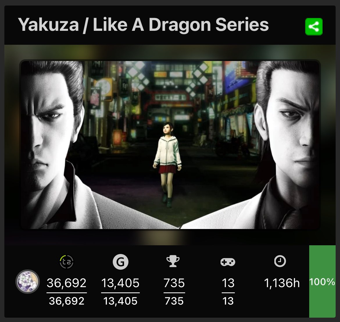 《如龙》玩家在一年内花费1100小时100%全通关系列13款游戏