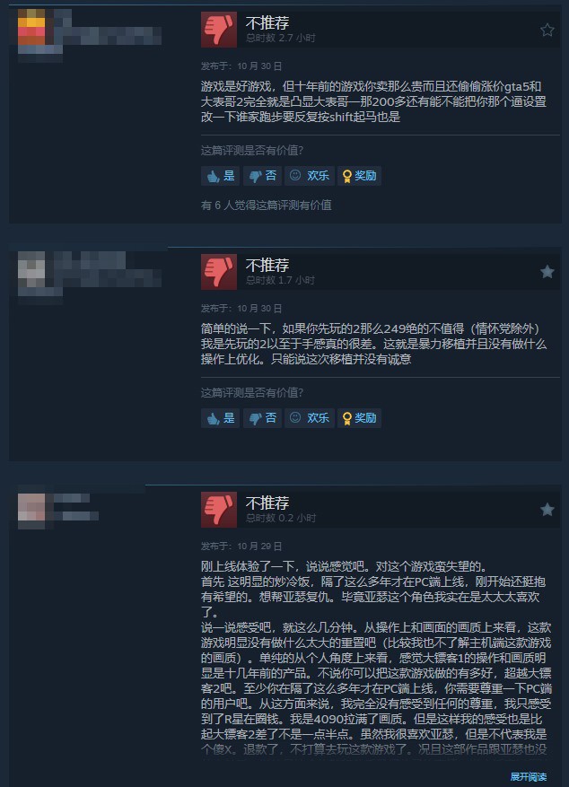 《荒野大镖客:救赎》已在Steam上发售,国区售价249元。目前该作在Steam总评为“特别好评”,许多人表示该作是属于百玩不厌的游戏,优化的很好不是暴力移植。 评论区给出好评的玩家认为,《荒野大镖客:救赎》保留了原作精髓,游戏优化得很好,不是暴力移植,画面可以接受。射击手感意外的好! 给出差评的玩家认为,《荒野大镖客:救赎》是好游戏,但十年前的游戏还卖那么贵。移植没有诚意,就是在炒冷饭。不是真爱粉不要买! 值得一提的是,《荒野大镖客:救赎》在Steam发布数小时后,就吸引了77655人进入游戏。并且该作在Steam热销榜上排名第三,仅次于《使命召唤:黑色行动6》和《反恐精英2》。 |