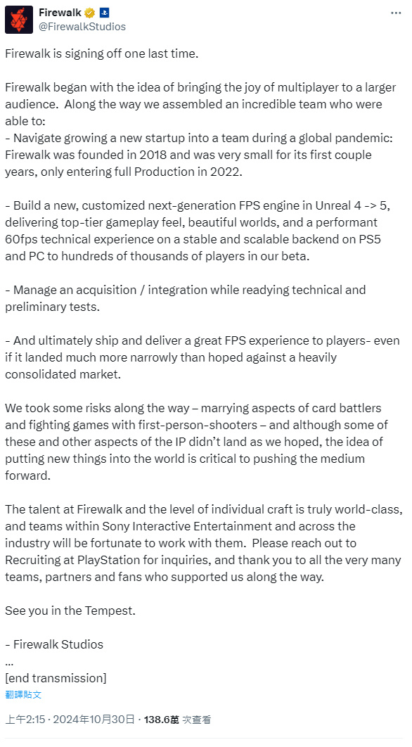 2亿美元开发仅售出2.5w份 《星鸣特攻》开发商官宣解散