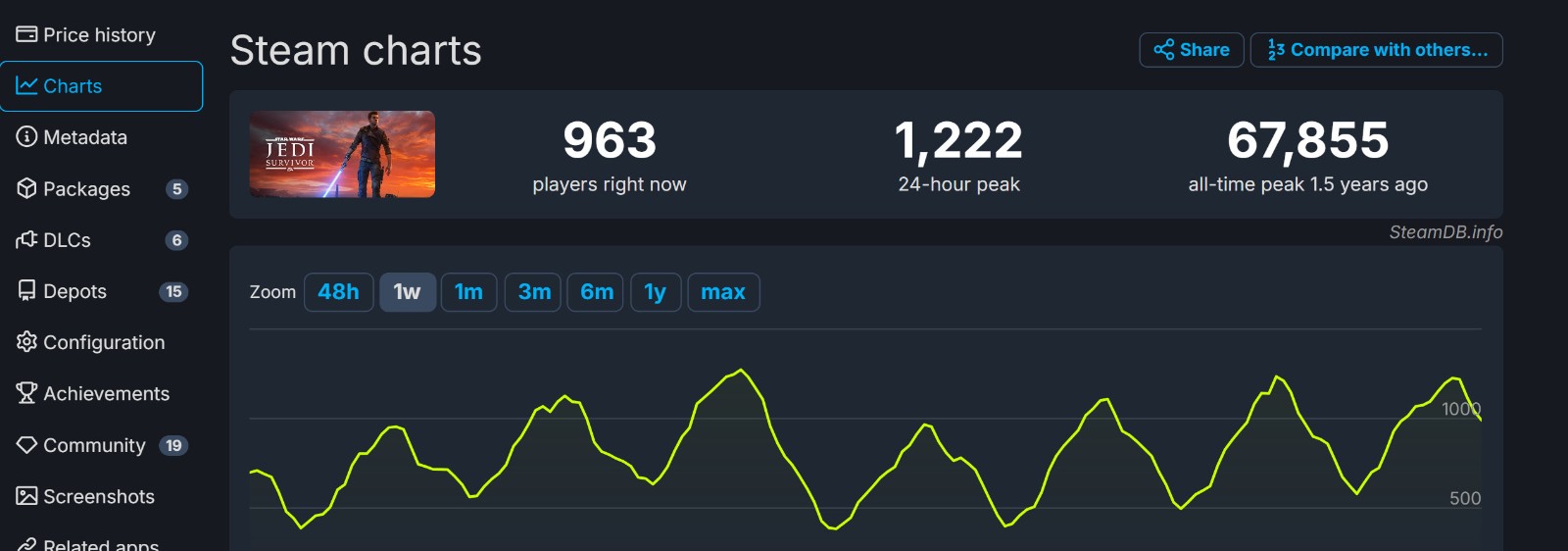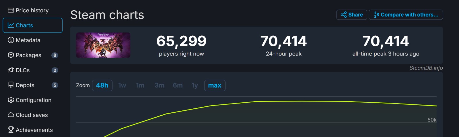 《龙腾世纪:影障守护者》在今天正式解锁发售,Steam国区298元,首发获得玩家“多半好评”评价,在1573个评价中,好评率76%。 而反应在在线玩家数量上,《龙腾世纪:影障守护者》也交了一份不错的答卷,它击败了重生娱乐的《星球大战绝地:幸存者》,成为EA在Steam上首发在线最高的单人游戏。 截止发稿时,《龙腾世纪:影障守护者》在线峰值70414人,而随着周末的到来,突破10万人恐怕不成问题。之前的记录由一年半前的《星球大战绝地:幸存者》保持,为67855人。 《龙腾世纪:影障守护者》当前在线6.5万人,入围Steam最热门游戏Top 10,目前位列第八名。 EA CEO Andrew Wilson在周二的财报电话会议上预测《龙腾世纪》将取得成功,并表示BioWare已“重拾优势”,而且由于育碧推迟了《刺客信条:影》的发售,导致《龙腾世纪:影障守护者》在同类型(动作RPG)游戏中几乎没有面临竞争。 |