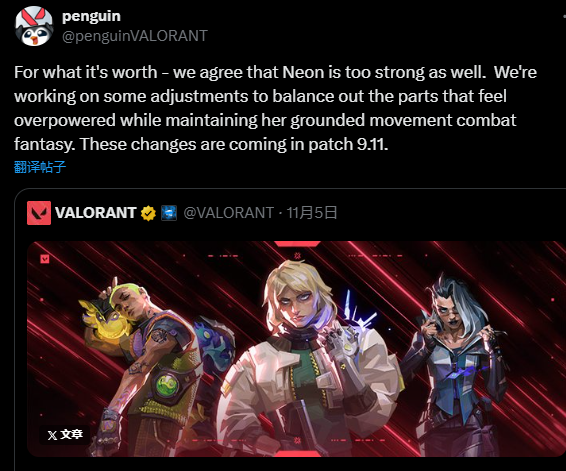 《无畏契约》即将于12月发布新更新9.1112,官方游戏设计师penguin今天宣布削弱霓虹角色,根据玩家的反馈来看,该角色的强度明显已经不平衡了。