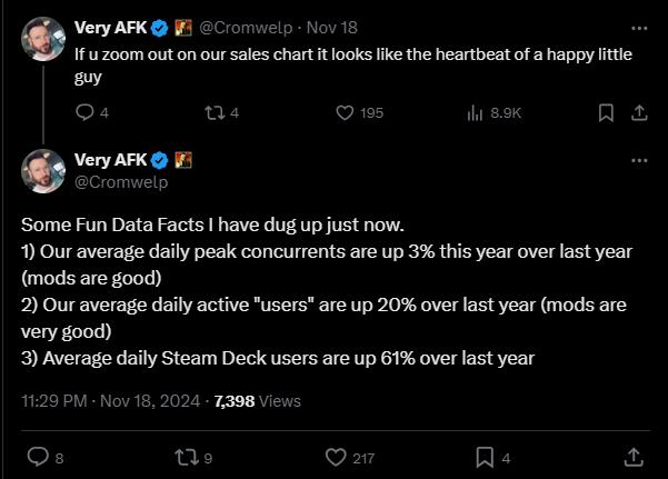 由拉瑞安工作室打造的CRPG游戏《博德之门3》,在2023年8月3日推出了正式版,并且荣获了TGA 2023年度最佳游戏等多项大奖。 近日拉瑞安发行总监Michael“Cromwelp”Douse在推特上发文透露,《博德之门3》在2024年的表现,意外的比发售第一年的表现还要好。 据Douse表示,他发掘出了3个有趣的数据统计,分别是“1)我们今年的平均每日峰值人数比去年增长了3%(归功于MOD);2)我们的平均每日活跃“用户”比去年增长了20(归功于MOD);3) Steam Deck的平均每日用户比去年增长了61%”。 不难看出《博德之门3》能保持玩家群体持续投入,可能主要归功于MOD的存在,尤其是今年拉瑞安提供了官方MOD支持工具,让玩家活动了更好的游戏体验。 |