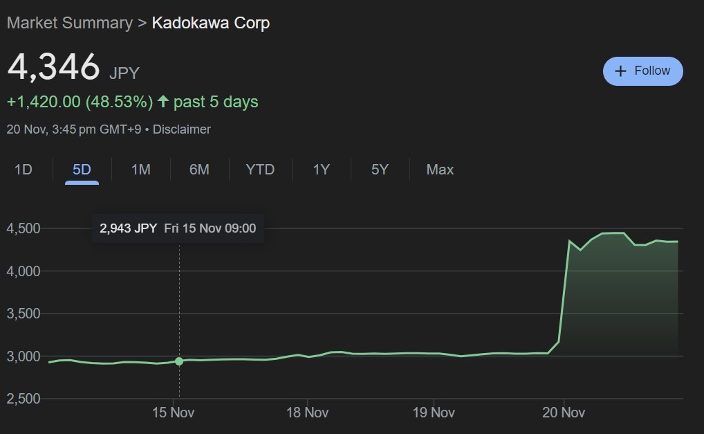索尼收购传闻导致角川股价大涨 而万代南梦宫股价下跌