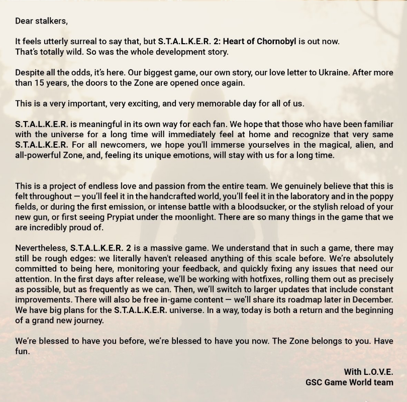 一款游戏的开发和制作过程,通常都得历经很多困难。有的是技术上的、有的是资金上的,但很少有游戏,会像今天要聊的这款游戏那样,更多承受的是来自外部环境的物理意义上的影响。甚至于在游戏首发当天,开发者最先给到玩家们的就是一封致歉信。 而这款游戏,正是由 GSC Game World 开发制作的开放世界射击游戏《潜行者2:切尔诺贝利之心》。 《潜行者2:切尔诺贝利之心》是《潜行者》系列的最新作品,作为一个重量级的游戏IP续作,它跟初代之间相隔了15年。从立项到开发,《潜行者2:切尔诺贝利之心》堪称命运多舛,在历经多次跳票之后,才在今日正式上线。 好在,《潜行者2:切尔诺贝利之心》用自身的质量,证明了玩家们的等待没有白费。首日的玩家在线峰值就达到11.3万,80%的好评率在同体量的游戏中,也属于水准线之上的作品。虽然PC和主机的优化方面还有一些问题,但未来依然值得期待。 回望《潜行者2:切尔诺贝利之心》的开发过程,就不得不提GSC Game World工作室原先位于乌克兰基辅的总部。在2022年因为俄乌冲突的出现,GSC Game World不得不搬迁到了捷克首都,期间游戏的开发工作无可避免的遭到了中断。 受到外部环境的影响,《潜行者2:切尔诺贝利之心》后续还删除了对俄语配音和文本的支持,并决定锁俄区,这让游戏天然就丢失了一大批忠实玩家。而在去年年初,GSC Game World又经历了一次信息泄露事件——有黑客将游戏数据给窃取了。 同年9月,GSC Game World所在的总部大楼又出现了火灾事件,烧毁了办公室设备,损失估计为150万捷克克朗(约合48.5万人民币)。虽然没有出现人员伤亡,但再次延缓了游戏开发工作。 原定于2023年年内发布的《潜行者2:切尔诺贝利之心》,后续宣布跳票到了2024年1月。中间又历经波折,直到11月大伙才真正玩到游戏。而在今天支持着游戏的玩家粉丝中,甚至不乏身处前线的人...... 《潜行者2:切尔诺贝利之心》的开发过程,可谓是多灾多难。好在GSC Game World的游戏开发者们坚持了下来,并最终完成了游戏的发布。游戏首发之日官方递出的致歉信,其实也是在向一直支持着他们的玩家,做出的一种致意。 致歉信中官方特别提到:“在发布后的头几天,我们将尽快处理紧急修复问题。之后,我们将转向包含持续性改进的大型更新。还会有免费的游戏内内容——我们将在12月晚些时候公布其路线图。” 多年来的开发,GSC Game World算是把所有雷都趟过来了,后续都是水磨功夫。未来也希望《潜行者2:切尔诺贝利之心》能够解决诸多优化问题,积极采纳玩家反馈,让游戏变得越来越好吧。 |