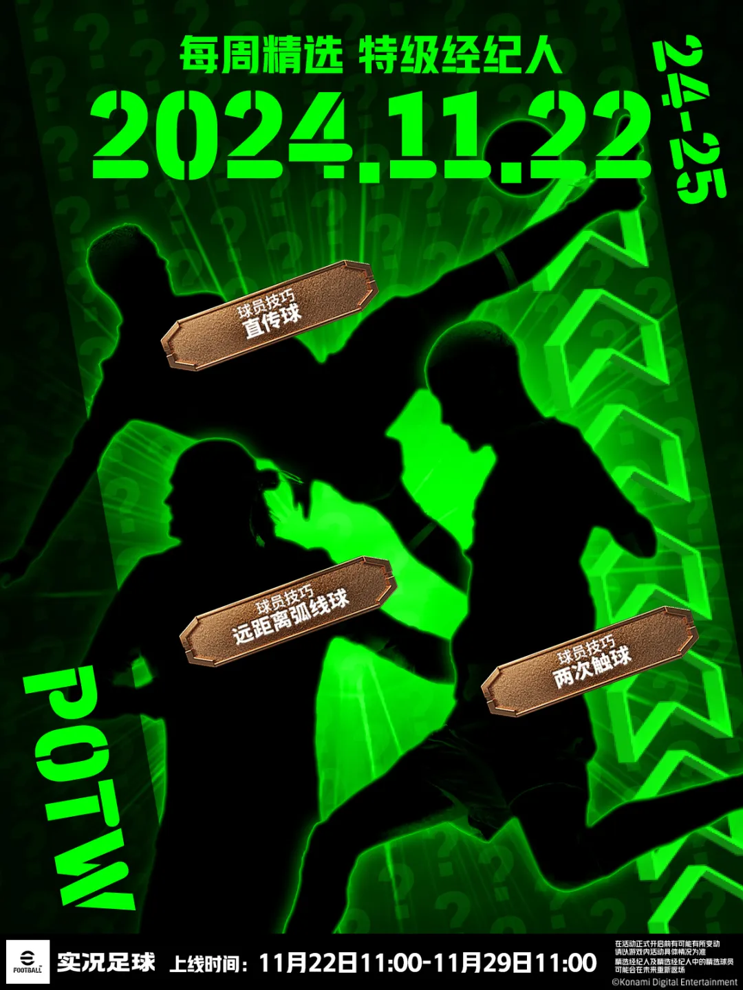 要说谁是实况手感最丝滑的球员 阿况必须要投罗纳尔迪尼奥一票! 顶级的盘控能力让小罗在实况中“人球合一” 而即将登场的双增能罗纳尔迪尼奥 更是有着评分破百的盘控能力! 想要完成一条龙单挑后防的精彩操作? 或许自带【旋风盘带】的他能助你实现! 更多精彩活动快跟阿况一起看看吧~ 活动一览 球队功勋 狂欢赠礼 每周精选 特级经纪人 (11.22~11.29) 全新版本 登录有礼 罗纳尔迪尼奥&内斯塔 挑战赛 焦点赛 拜仁慕尼黑vs巴黎圣日尔曼 利物浦 红vs马德里查马丁 白 金球制胜 在线对抗赛 活动详情 球队功勋 狂欢赠礼 双增能罗纳尔迪尼奥将通过【球队功勋 狂欢赠礼】首次登场!除此之外,你还将有机会获得增能史诗高光因扎吉、坎比亚索、贝隆、内斯塔、麦孔,史诗高光伊涅斯塔、科尔多巴。想要补强球队的玩家们,千万不要错过此次活动! 累计抽取达到指定次数即可获得【5星经纪人(10%含球队功勋)】、【5星经纪人(30%含球队功勋)】、【球队功勋 高光经纪人】、【球队功勋?自选 高光经纪人】! 罗纳尔迪尼奥 罗纳尔迪尼奥的球风潇洒飘逸,灵动梦幻的桑巴舞步,宛如孩童手中的画笔般天马行空!作为巴萨梦二王朝的核心之一,小罗用仅用207次出场,就打进94球并贡献了61助攻,他也成为球队拿下五座冠军奖杯的绝对功臣! *双增能加成后总评101分,上阵最大总评可达104分 2005~06赛季,罗纳尔迪尼奥在巴塞罗那大放异彩,他不仅单赛季送出26个进球和24次助攻的恐怖数据,还带领巴萨拿下了联赛冠军和欧洲冠军!也正是在该赛季,小罗一人一球单挑银河战舰的天价后防,用极致的个人英雄主义进球,赢得了伯纳乌的漫天掌声! 小罗的第一增能为【幻想家+2】 桑巴精灵的梦幻舞步将在实况上演! 自带特殊技能【旋风盘带】的小罗 还有着高达100分的控球和盘带! 这让他在禁区内带球过人如入无人之境! 在边路内切搓射是小罗的常规得分手段 假射晃开防守队员后加速横向突破 随后只需一脚轻巧搓射,即可洞穿球门! 在【不看球员传球】和【一脚出球】加持下 小罗潇洒写意的传球将为队友送上助攻 活动时间: 2024/11/22 11:00~2024/11/29 11:00 每周精选 特级经纪人 (11.22~11.29) 【每周精选 特级经纪人(11.22~11.29)】明日上线,你将有机会获得本周在赛场表现优异的精选球员。 谁说这前锋老了,这前锋太香了!39岁老将梦回巅峰,一脚惊天倒钩唤醒了多少人的青春?兄弟们觉得本周还有谁的表现能够入选本周精选呢? 活动时间: 2024/11/22 11:00~2024/11/29 11:00 全新版本 登录有礼 【全新版本 登录有礼】活动期间,每日登录游戏即可获得丰厚奖励!累计登录7天,最多可以获得【150金币】、【技巧训练*2】和【位置训练】作为奖励! 活动时间: 2024/11/22 11:00~2024/11/29 23:59 罗纳尔迪尼奥&内斯塔 挑战赛 战胜【罗纳尔迪尼奥&内斯塔 挑战赛】中的对手,你将赢得【金币】和【高光定向券】作为奖励。完成更多阶段任务,可以获得更丰厚的奖励!你需要挑战多位强敌,才能成为最终的胜者! *详情活动规则请以游戏内公告为准 活动时间: 2024/11/22 11:00~2024/11/25 11:00 焦点赛?拜仁慕尼黑vs巴黎圣日尔曼 利物浦 红vs马德里查马丁 白 虚实同步,双重激情!【焦点赛 拜仁慕尼黑vs巴黎圣日尔曼 利物浦 红vs马德里查马丁 白】将在明日上线。该玩法分为预热期、热潮期和复盘期三个阶段,完成各个阶段比赛目标即可获得代币,使用代币还可兑换【赛季精选经纪人】、【5星经纪人(10%含赛季精选)】等道具奖励。 *详情活动规则请以游戏内活动公告为准 活动时间: 2024/11/22 11:00~2024/11/29 11:00 金球制胜 在线对抗赛 参与并完成【金球制胜 在线对抗赛】,你将赢得【金币】和【高光定向券】作为参赛奖励。快来参加这场激烈的对抗吧! *详情活动规则请以游戏内活动公告为准 活动时间: 2024/11/22 11:00~2024/11/25 11:00 *以上活动实际奖励内容,在活动正式开启前有可能有所变动,请以游戏内活动奖励说明为准。 |