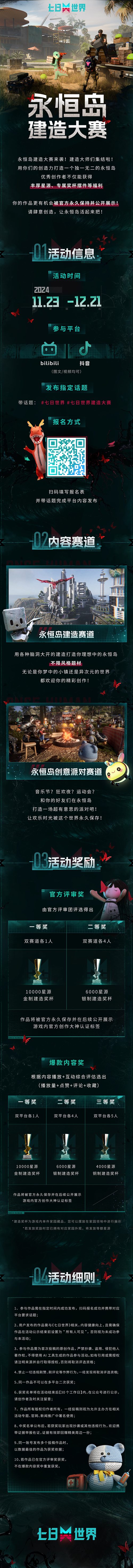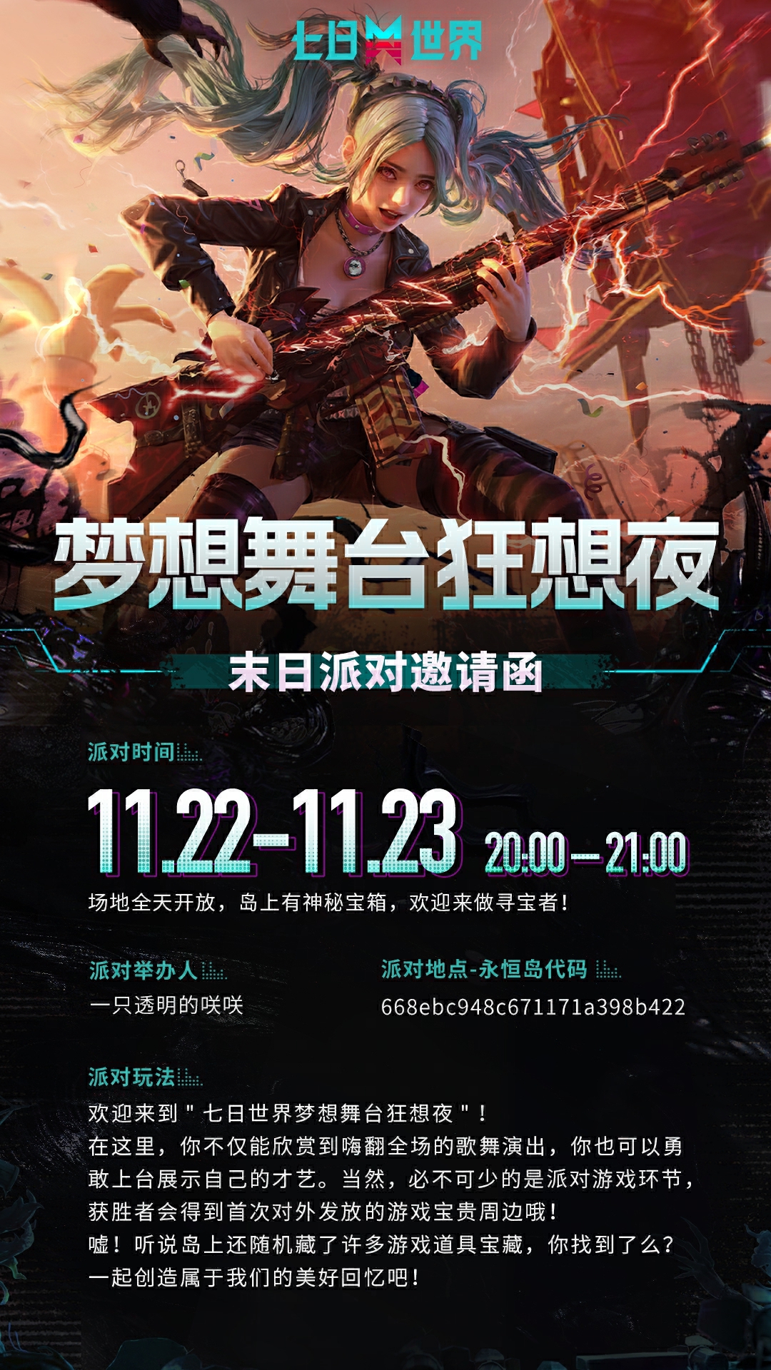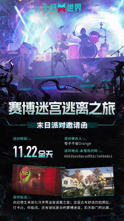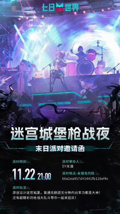 超越者们好啊!自从咱们的派对激励计划发布以来,小七就收到了超多超越者的精彩派对方案!不得不说咱们超越者真的创意爆棚~那么今天,小七就要向大家发出4位玩家大大们的派对邀请! 惊险刺激的极限挑战?有! 福利满满的惊喜掉落?有! 精彩绝伦的现场表演?有! 那么就跟着小七一起往下看,感兴趣的超越者们记得准时前往参与噢,场地中还会埋下彩蛋福利等你发现~ 本期玩家派对推荐 梦想舞台狂想夜 欢迎来到"七日世界梦想舞台狂想夜"! 在这里,你不仅能欣赏到嗨翻全场的歌舞演出,也可以勇敢上台展示自己的才艺。当然,必不可少的是派对游戏环节,获胜者会得到限量游戏周边哦! 嘘!听说岛上还随机藏了许多游戏道具宝藏?你找到了么? 一起创造属于我们的美好回忆吧! 【派对时间】 11月22日-11月23日 场地全天开放 特别派对时间 20:00 – 21:00 【派对举办人】 一只透明的咲咲 【永恒岛代码】668ebc948c671171a398b422 末日极限运动会 七日世界末日极限运动派对来袭! 众多独创小游戏等你来挑战,不仅有人美声甜的主持人小姐姐,更有惊险刺激的空中走索、锻炼反应能力的抢凳子大赛、激情四射的的机车大战等期待挑战者前来挑战! 参与派对还能领取神秘游戏礼包和精美游戏周边!? ?? 【派对时间】 11月22日-11月23日 场地全天开放 特别派对时间 21:00-22:00 【派对举办人】 彼岸 【永恒岛代码】668e638c97786909694cbc75 迷宫城堡枪战夜 原创设计的迷宫城堡欢迎超越者们前来挑战!首通无剧透五分钟内出来的都是大神!我还会在迷宫里埋下惊喜奖励哦~更有超精彩的枪战大乱斗等你一起来狂欢! 【派对时间】 11月22日 21:00 【派对举办人】 DY呆酒 【派对地点】 永恒岛代码66a1ea457d45441fb126ef4c 赛博迷宫逃离之旅 "欢迎宿主来到七日世界迷宫逃离之旅" 这里会有舒适的拍照区,打卡点,样板间。还有错综复杂的赛博迷宫,和无数门的逃离...迷宫中的惊喜礼包,你会发现吗? 【派对时间】 11月22日 全天可进入游玩 【派对举办人】 橙子不是Orange 【派对地点】 永恒岛代码6693bae9acedf82c7e69e8e1 那么,超越者们最期待的派对是哪一个呢?11月22日-23日,记得前来串门!!也欢迎大家在评论区留下自己的永恒岛代码邀请大家一起来玩,我们还举办了永恒岛建筑大赛,欢迎各位超越者展现自己的永恒岛建造成果,还有丰厚奖励等着你! 以上就是活动的所有内容啦,更多精彩内容欢迎关注我们的官方通告~ |