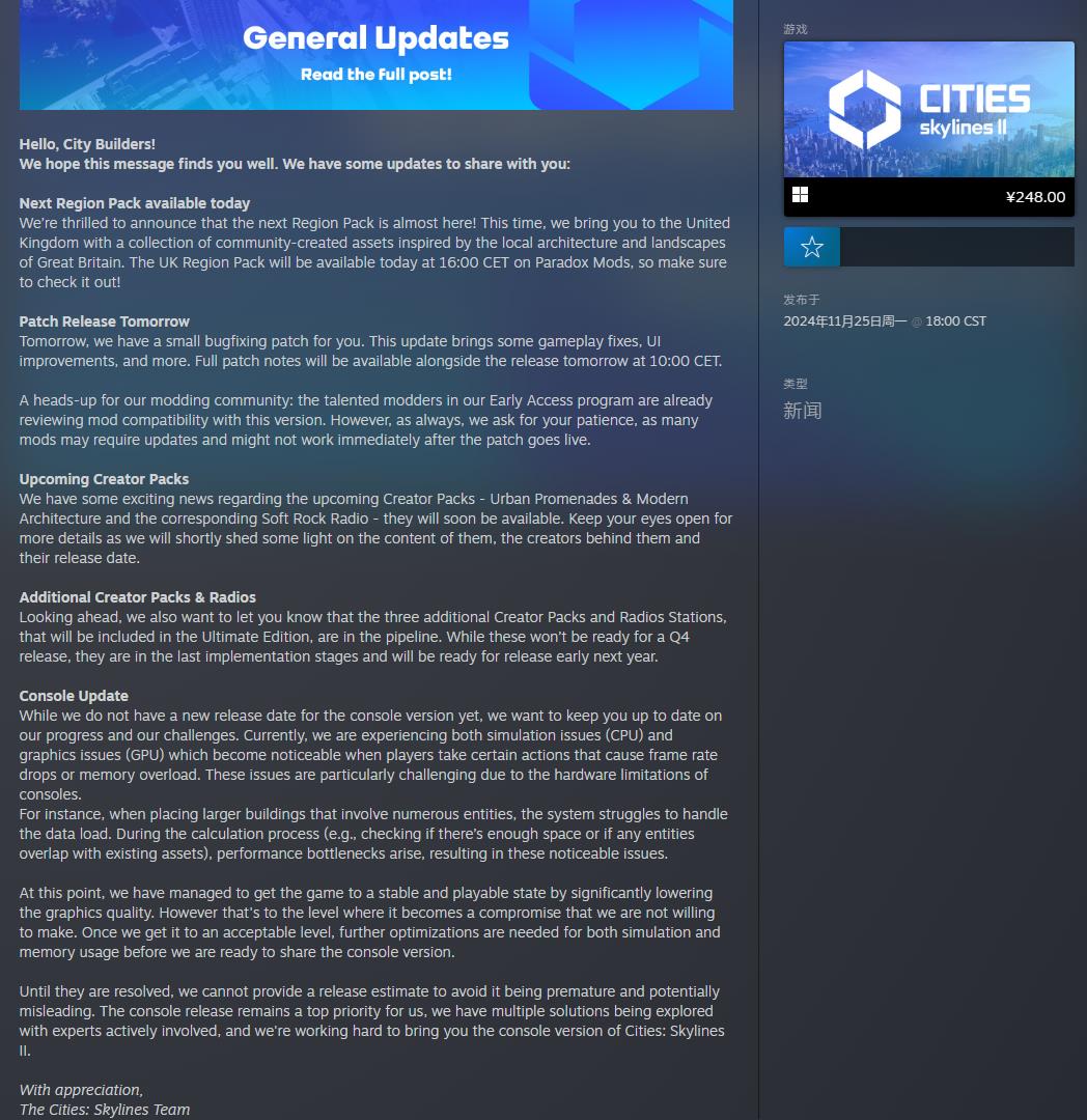 由P社发行的沙盒模拟建造游戏《城市:天际线2》,原计划在2023年10月期间于PC、Xbox和PS5平台上推出,但最终仅在PC上发布(2023年10月24日推出),其主机板则一再延期。 而受到PC版性能问题等影响,《城市:天际线2》在发布时引起了一些争议,其Steam平台上的总体评价至今还是53%好评率的褒贬不一,这也使得官方决定无限期推出主机板的发布。 近日开发商Colossal Order在《城市:天际线2》的更新说明中,解释了主机板迟迟未能上线的缘由,官方表示:“目前,我们遇到了模拟问题(CPU)和图形问题(GPU),当玩家采取某些导致帧率下降或内存过载的操作时,这些问题会变得明显。由于游戏机的硬件限制,这些问题尤其具有挑战性。” 此外Colossal Order还举例说明例如“在放置涉及众多实体的大型建筑物时,系统难以处理数据负载。在计算过程中(例如,检查是否有足够的空间或是否有任何实体与现有资产重叠),会出现性能瓶颈,从而导致这些明显的问题。” 可惜的是“目前,我们已设法通过大幅降低图形质量使游戏处于稳定和可玩的状态。然而,这已经到了我们不愿意做出妥协的程度。一旦我们将其降低到可接受的水平,在我们准备好分享主机版本之前,还需要对模拟和内存使用进行进一步优化。因此Colossal Order决定在这些问题得到解决之前,无法提供发布估计,“以避免它过早发布并可能产生的误导”。 |
