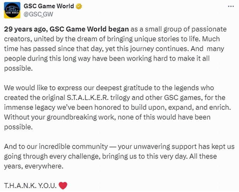 《潜行者2》已正式发售,发售两天就售出100多万份。近日GSC Game World在推特上发感谢信,感谢玩家们的支持,以及开发团队的努力。