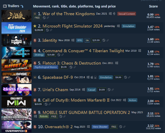 10.《钢铁雄心4》 发布于11月20日的《潜行者2:切尔诺贝利之心》,作为一个经典IP的续作没有辜负玩家们的期待。虽然首发后因为优化问题影响到了观感,但目前依然取得了“多半好评”的评价。 这家原本总部位于乌克兰的开发商,过去几年来经历了工作室搬迁、主创团队人员伤亡、工作室起火、数据偷跑等一系列事件,依然将游戏带给了玩家实属不易。接下来也希望通过不断的内容更新,《潜行者2:切尔诺贝利之心》能变得越来越好吧。 《使命召唤:黑色行动6》和《使命召唤》分列榜单第三和第七,作为“年货游戏”的代表性作品,这个IP从来不愁热度。不过这款多人在线游戏,却始终遭受着外挂问题的侵扰。为了玩家体验着想,动视还得多上点心。 《微软飞行模拟2024》排在榜单第四位,可自游戏正式发布以来,本作的差评数却迅速飙升,一度来到了仅次于《三国杀》的地步。究其原因,还是因为网络连接问题。因为游戏的大部分内容都是存储于云服务器,游戏卡顿、掉线情况严重。 这同时也是Xbox游戏登陆Steam后,收获差评数最多的游戏。 排在第六的《模拟农场25》和第八《露玛岛Luma Island》都是种田游戏,它们一个偏写实、一个偏卡通。后者在不久前才结束测试正式上线,是本期榜单上为数不多的新游。在缺乏现象级爆款大作的情况下,这类偏休闲的模拟经营类游戏往往能取得一些不错的排名。 至于《迪士尼梦幻光谷》和《钢铁雄心4》这两款老游戏的上榜,凭借的则是扩展包等内容更新。 2024年仅剩一个月,有分量的3A大作也越来越少了。由于Steam秋促将在28日凌晨开启,可以预见的是未来几周,将会有大量经典游戏冲进TOP 10名单。 不知道大家愿望单中的游戏,进入骨折名单了吗? |