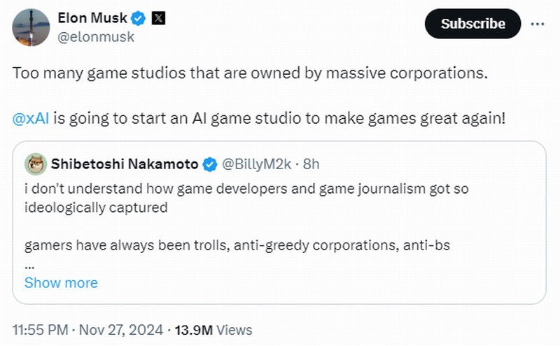 特斯拉、推特老板埃隆·马斯克是一位游戏玩家,他经常在推特上发布与游戏相关的消息,并坚决反对DEI游戏,这在网上引起很大争议。 近日马斯克在推特上发文,他表示:“太多的游戏工作室被大公司收购。我旗下公司xAI将成立一家AI游戏工作室,让游戏再次伟大起来”,此外他还说:“那些开发商就不能好好做游戏吗?跳过觉醒说教。” 马斯克的这番话表明其对游戏业现状非常不满,并希望借助自己的技术背景,通过创新方式推动游戏业发展。 此前马斯克曾批评《刺客信条:影》引入DEI元素,将扼杀这款游戏。另外他还反对《宣誓》加入性别代词,并与该作美术总监马特·汉森(Matt Hansen)发生冲突,汉森称马斯克是变态。 |