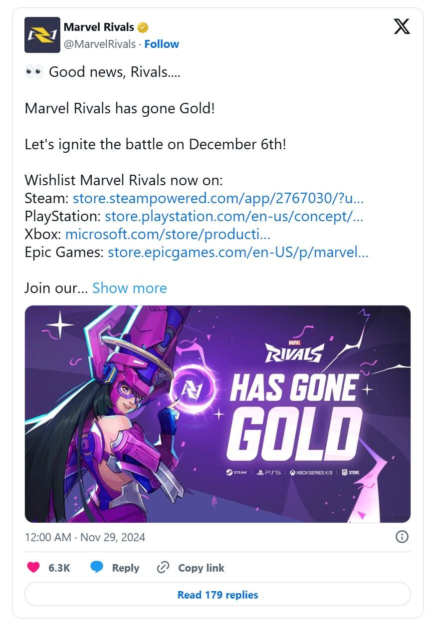 在发行前大约一周,网易的《漫威争锋》宣布已完成开发部分的所有工作(Gone gold)。这款免费英雄射击游戏将于12月6日在Xbox Series X/S、PS5和PC平台上推出,目前在Steam上最受欢迎的游戏中排名第六。 《漫威争锋》首发推出33名英雄和8张地图,其中包括瓦坎达星际帝国和克林塔(共生体星球)等地点。故事围绕着现今和未来版本毁灭博士之间的冲突展开,并波及整个维度结果。因此,另一个版本的英雄和反派也加入了战局,有时他们会在同一个团队中结成不稳定的联盟。 虽然游戏与《守望先锋2》有些类似,特别是在游戏模式和角色分工方面,但《漫威争锋》还提供了其他新特色,如环境破坏和团队合作攻击。该游戏仍将采用赛季式设计,“第0赛季:毁灭崛起”将持续一个。第一季将于2025年1月开启,并将提供新内容。 |