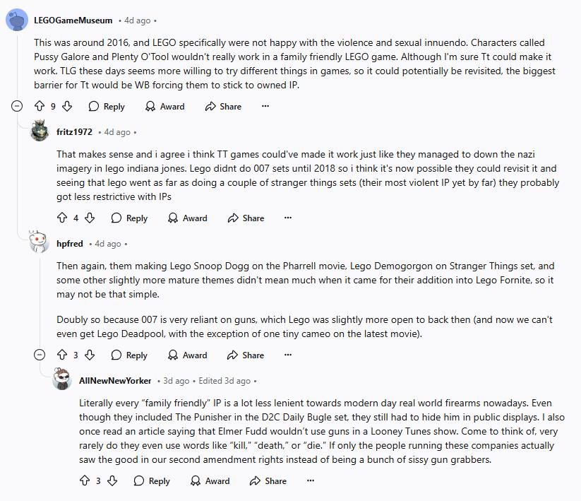 虽然《007》系列电影在丹尼尔·克雷格结束饰演主角詹姆斯·邦德后暂无具体的新计划,但近日互联网上流传出了《乐高007》游戏的预告。 《乐高007》游戏泄露预告: 在预告片中可以看到《007》电影系列中的一些经典人物形象和标志性的镜头,例如对《生死关头》和《雷霆杀机》的致敬。而据泄露该预告的reddit用户“kecskecske6”表示,这就是一部官方预告片,但并不能确认是否属实。 不过在该视频链接的评论区有人补充了相关内容,表示这并非是为了《乐高次元》这款游戏的年3制作的,而是在《乐高次元》开发的最后一年决定的,因为当时确认了不会有年3的内容。 但由于在2016年期间乐高方面对暴力和性暗示内容特别不满,因此《乐高007》的相关内容也被认为不符合乐高合家欢游戏的氛围,因此遭到了取消。 |