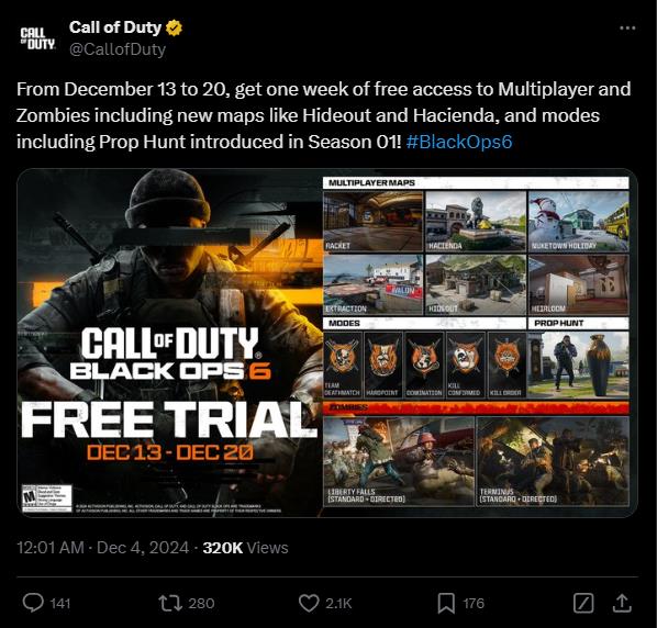 《使命召唤21:黑色行动6》已在10月25日正式推出,而本作在首发时便已加入XGP。 近日动视官方宣布,将从12月13日开启为期一周的免费试玩活动,至12月20日结束,将面向Xbox、PlayStation和PC平台上的玩家。 据动视官方分享的《使命召唤21:黑色行动6》7天免费试玩活动的宣传图中可以看到,该试玩版本将包含6张多人地图,多达5种的游戏模式,以及在第一赛季中推出的“PROP HUNT”模式。此外《使命召唤21:黑色行动6》的免费试玩版还将包含“Liberty Fall”僵尸模式和名为“Terminus”的僵尸地图。 不过目前尚不清楚玩家在《使命召唤21:黑色行动6》的免费试玩版中获得的经验值等奖励,能否保留到正式版中。 |